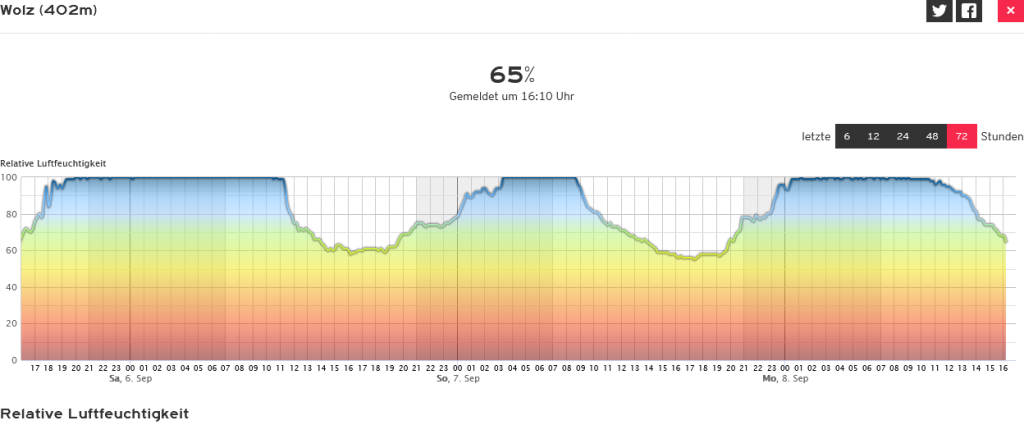 Ik heb even gekeken naar het verloop van het dauwpunt en de relatieve vochtigheid in de afgelopen 72 uur. Eergisteren was het mistig tot tegen 11 uur in de ochtend, en je ziet dan ook dat het dauwpunt tussen 8 en 11 uur stijgt van 7 naar maar liefst 15°C, gelijkopgaand met de temperatuur, om daarna dan weer te dalen. De relatieve vochtigheid was al bijna 100% vanaf de vorige avond iets na 19 uur, en al rond 22 uur (of misschien al eerder) werd het mistig. De R.V. is dus 16 uur lang bijna 100% geweest!
