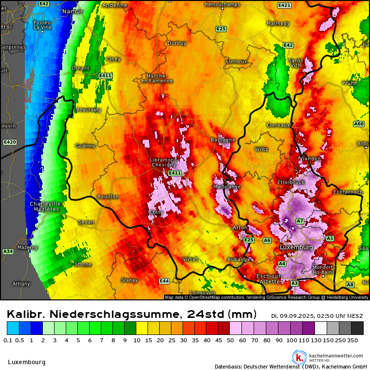 Philippe Ernzer van Meteo Boulaide meldt dat er op ASTA-station Beringen bij Mersch al 126,5 mm gevallen is; de calibratie klopt dus redelijk goed. Of misschien is er nog wel meer gevallen, want Beringen ligt in de noordoostelijke donkerpaarse vlek, een eind ten zuiden van Ettelbruck; dus niet vlakbij de twee gebiedjes met 130+mm op de kaart.