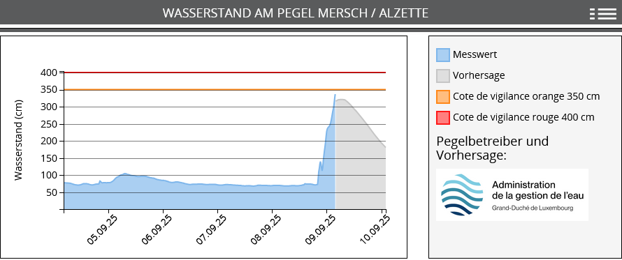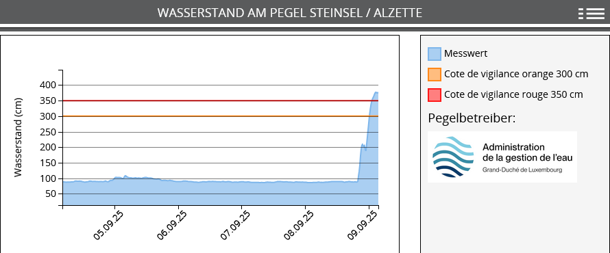 De waterstanden lijken relatief gezien nog mee te vallen: alleen Steinsel heeft het alarmniveau ruim overschreden, maar op veel plaatsen stijgt het water nog. Mersch zal nog wel volgen, in elk geval oranje. En in het zuidwesten stijgt de Chiers ook flink; gisteravond liet ik een afbeelding zien dat men in Differdange een waterkering probeerde aan te leggen. Misschien helpt die.