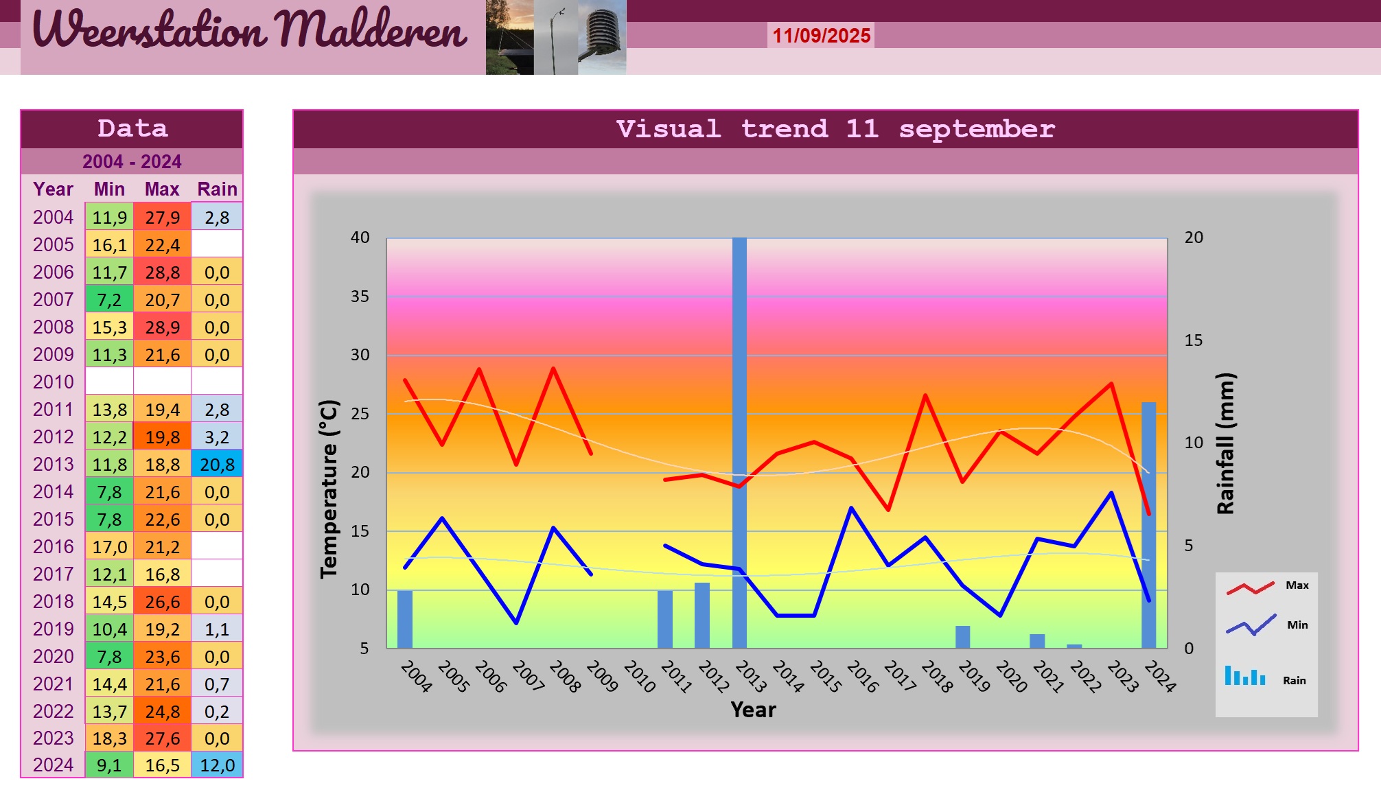 Dreigende wolkenmassa's maakten vanochtend hun opwachting, maar het was nog steeds poederdroog. Nochtans zijn er reeds diverse buien gevallen en een vijftal kilometer ten oosten van het weerstation lag de omgeving er al druipnat bij met flinke plassen. Door de bewolking was het erg zacht met temperaturen die nog rond 16 graden schommelden bij zonsopgang. In deze wolkenvelden zaten nog talloze buien verscholen en deze wisten in de loop van de dag alsnog Malderen te bereiken. Voor zover bekend zat er geen onweer bij al was de neerslag in Brussel wel pittig op sommige momenten. Voor klank en lichtspel moesten we vooral in Limburg zijn waar het wel tot onweer kwam terwijl er later ook in Nederland een aantal ontladingen plaatsvonden. De wind ruimde naar westelijke richtingen met een uitschieter tot 27,4 km/h uit het west- zuidwesten en er werd veel koelere zeelucht aangevoerd. We moesten het doen met maxima van 19,8 graden terwijl de zon er nauwelijks aan te pas kwam. Tijdens de namiddag kwamen we aan de achterzijde van het koufront terecht waar we de karakteristieke blauwe lucht met stapelwolken erin zagen verschijnen. Hierin ontstonden weer wat buien al viel er op deze locatie geen noemenswaardige neerslag meer. De stapelwolken lieten het geleidelijk afweten naar de avond toe om plaats te maken voor wat sluierwolkjes en Stratocumulus veldjes. Het koelde stevig af waardoor we nu pas de minima bereikten die 12,2 graden bedroegen. Het neerslagtotaal is op 3,2 mm uitgekomen.