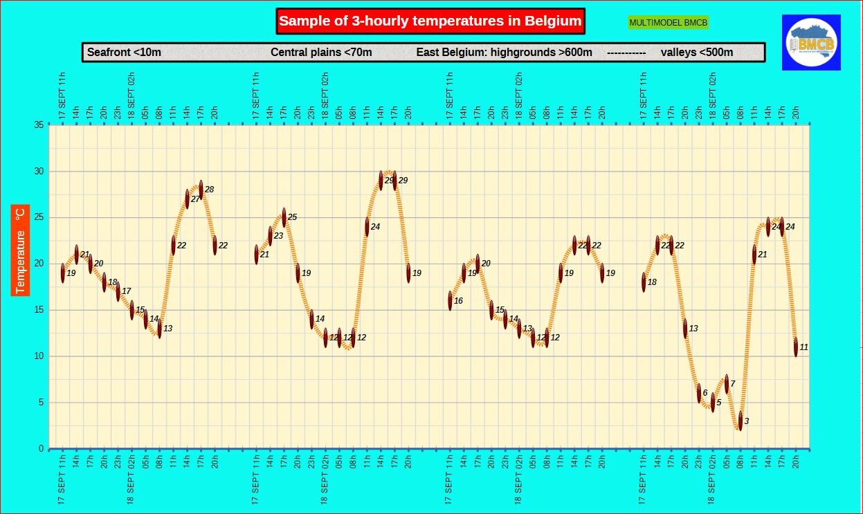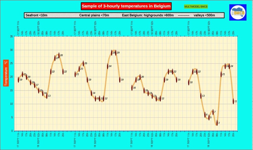 Minima: 13°C aan de kust, 12–16°C in het binnenland, 12–15°C ten zuiden van Samber en Maas, maar slechts 3–11°C in de Ardense valleien.
