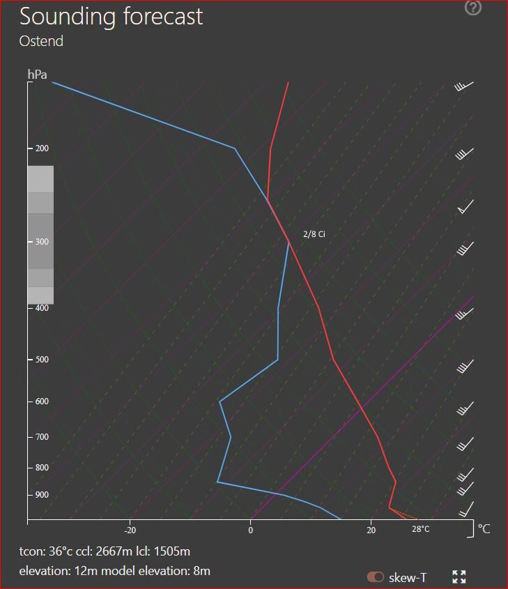 Het multimodel BMCB geeft geen zeebries (Zuid 8Knopen) en een hyperadiabaat van 2° wegens zeer droge lucht op zandgrond=> 28° op 't strand en 29° 1 à 2km inland !