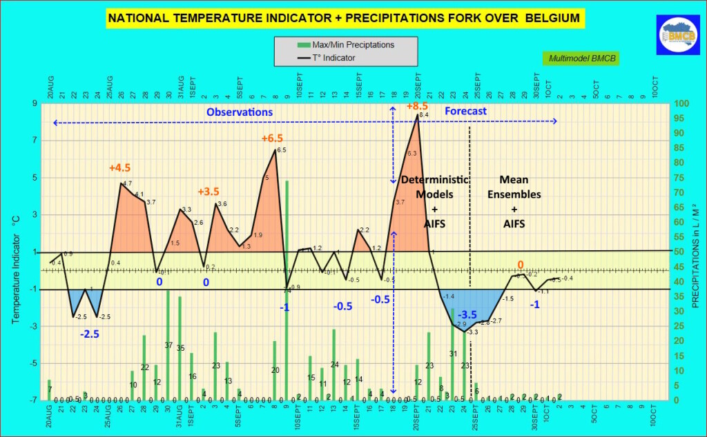 Maar deze warmte-uitstap is van korte duur: vanaf 22 september zakt de index in het negatieve, tot –3 à –4, en dat tot 27 september. Dan keren uitgesproken herfstomstandigheden terug: maxima van 9–15°C op de koudste dagen en 12–18°C op de minder frisse dagen.