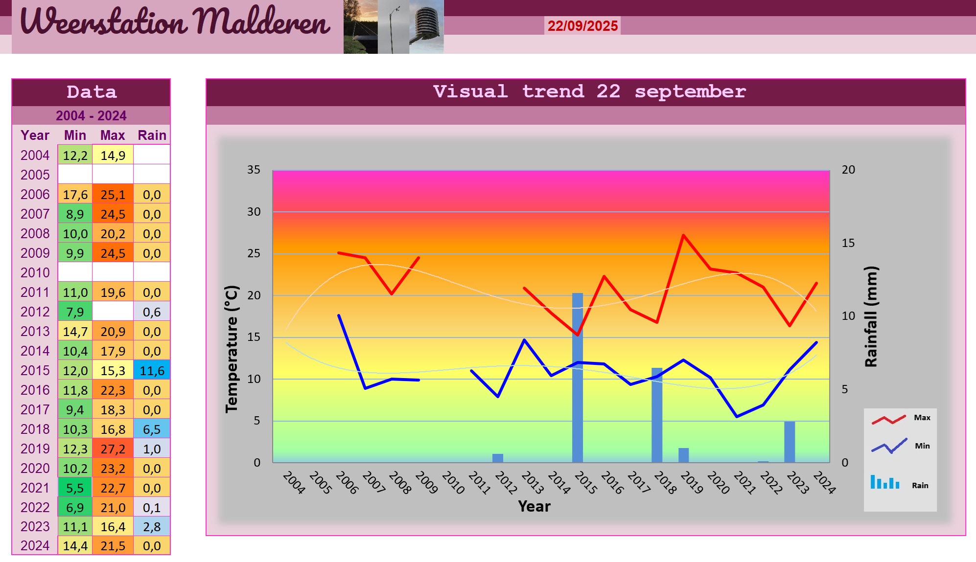 Het was koel met minima van 10,3 graden en de dag maakte een sfeervolle start met Cirrostratus, Altocumulus en Altostratus die voor een mooi gekleurde zonsopgang zorgden. De bewolking werd dikker dan voorspeld en deze droge dag bleek uiteindelijk een regendag te worden waarbij het vooral tijdens de namiddag erg druilerig werd. Vooral in het westen viel redelijk wat neerslag maar in Malderen bleek het allemaal erg mee te vallen al was het hier zeker geen nazomerweer met temperaturen die op 16,8 graden bleven steken en een zwak waterzonnetje dat er hooguit af en toe eens doorheen priemde. Gelukkig was de westelijke tot noordwestelijke wind zwak waardoor die niet al teveel kattenkwaad kon uitrichten. Tijdens de avond kregen we met wat intensere regen te maken waardoor de pluviometers in Malderen zich ook nog eens konden in beweging zetten na wekenlang stilzitten. We kwamen reeds uit op 6,5 mm tegen het einde van de avond.
