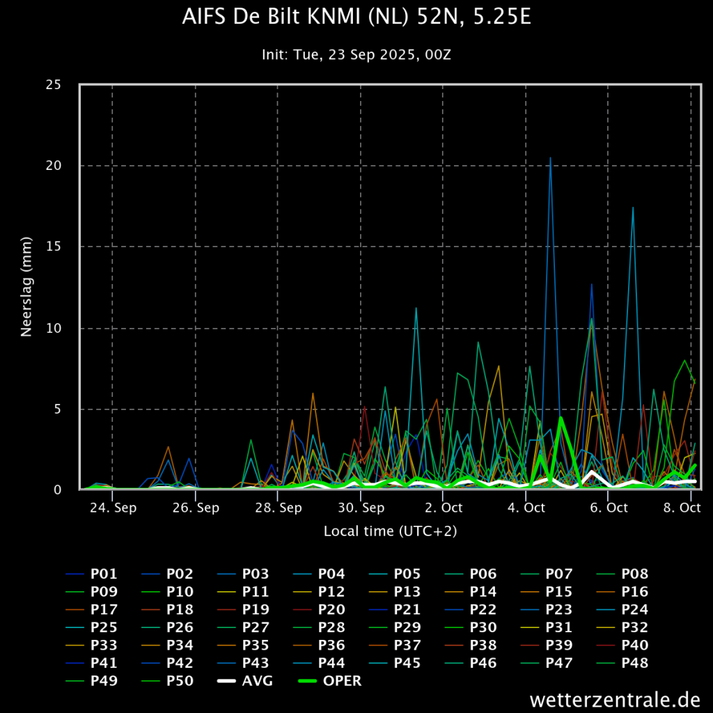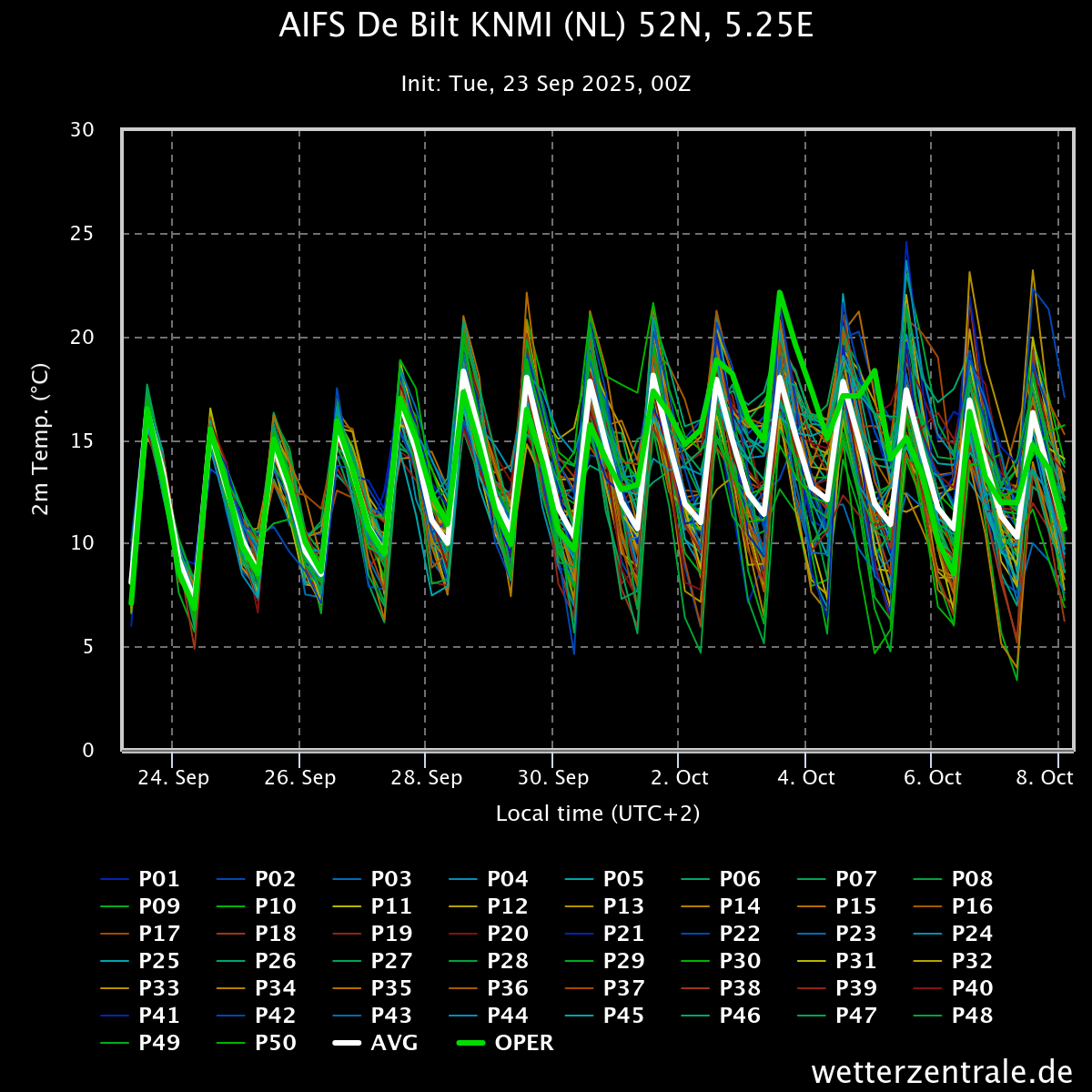 Zie onderstaand ook de ensembles voor temperatuur en neerslag van De Bilt. De operationele run valt wel binnen de bandbreedte van het ensemble, maar qua uiterlijk valt die toch uit de toon gezien het ensemble nog altijd een zaagtand laat zien.