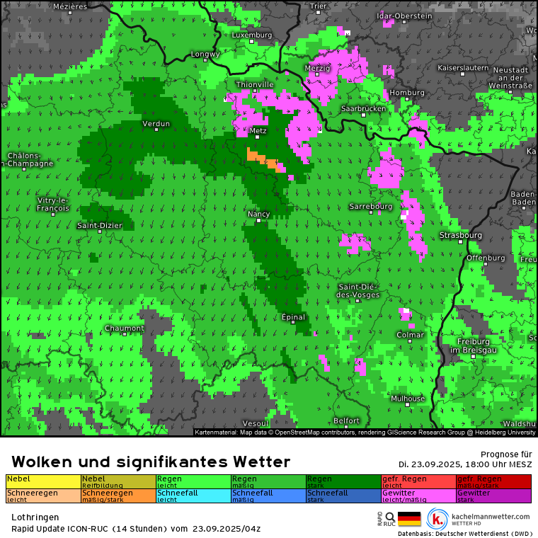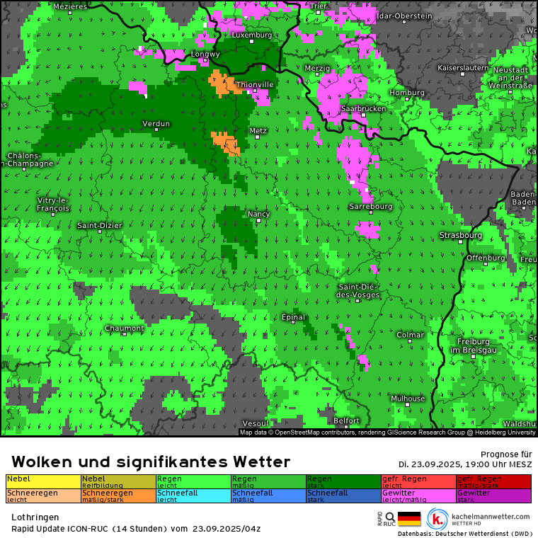 Vanochtend gaf ICON-D2 RUC even een paar plekjes met natte sneeuw voor vanavond 18 en 19 uur. Maar dat model moet duidelijk nog wat bijgeschaafd worden: de temperatuur zou in die gebieden ineens zakken naar 3 à 4 graden, wat wijst op isothermie, en daar moet je het in september toch nog niet over hebben.