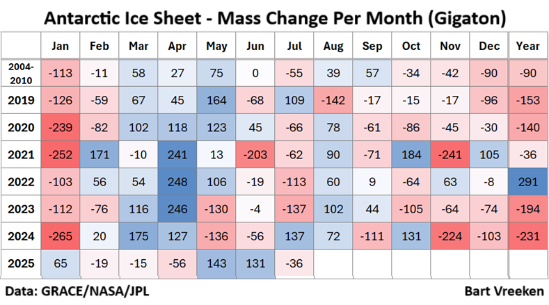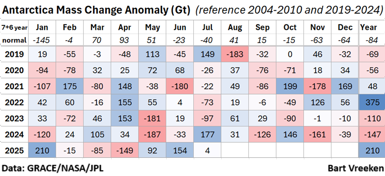 Het massaverlies per jaar is volgens NASA nu afgenomen tot 134 Gigaton per jaar (regressie). Het rekenkundig gemiddelde geeft een massaverlies van ca 108 Gigaton per jaar sinds 2002.