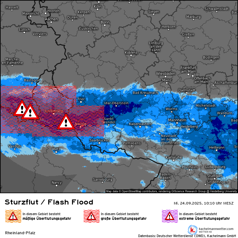 Nou ja, wat is helemaal losgaan? Het gaat wat langzamer dan twee weken geleden, maar we zijn er nog lang niet, dus het kan vanavond nog wel erger worden dan toen. Dat dan vooral in het zuiden. Het overstromingsgebied op de weergave van Kachelmannwetter is een stuk groter geworden. Zie de tweede afbeelding.