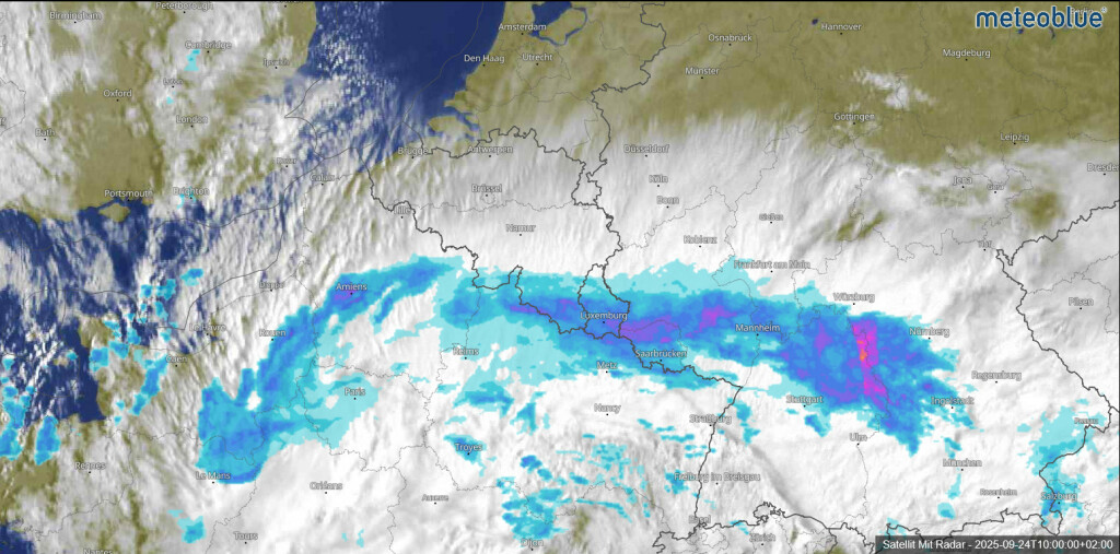 Op het satellietbeeld is niet alleen de langgerekte neerslagband te zien, maar aan de noordkant ook van west naar oost de bewolking die in een soort mega-spissatus-structuur uitmondt. Ik dacht dat je dit alleen bij tropische stormen zag? Of zou het te maken hebben met de geringe verplaatsing van het systeem?
