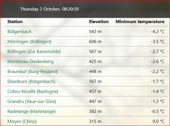In het oosten en zuidoosten van België liet de winter zich al voelen: in sommige valleien zakten de nachtelijke en ochtendtemperaturen tot tussen 0 en –4 °C.