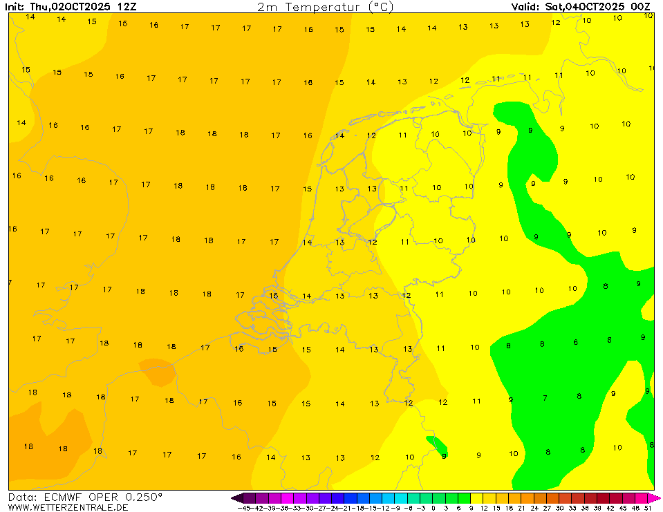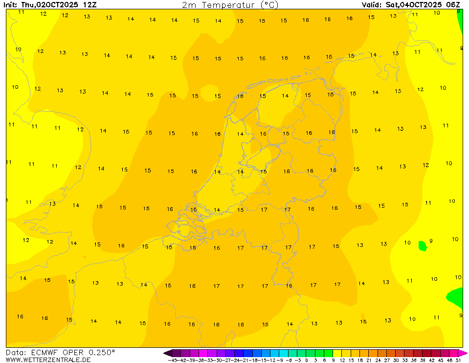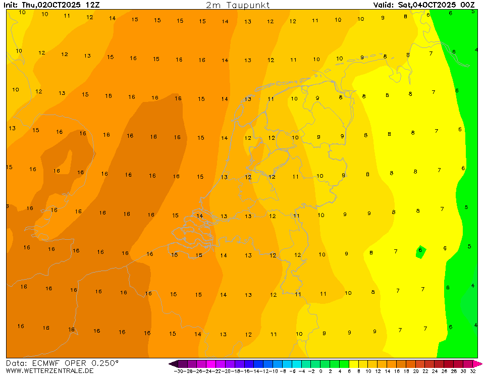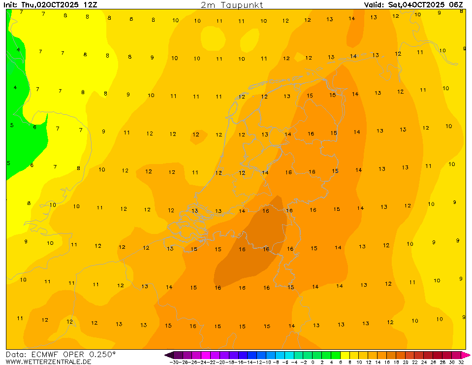 Kijk maar naar het tijdvak van 0600 UTC op zaterdagochtend. Dan berekent het EC ens een tact van 12-13 graden Celsius, met een dauwpunt van 14-16 graden Celsius. Ergens gaat daar waarschijnlijk iets mis.