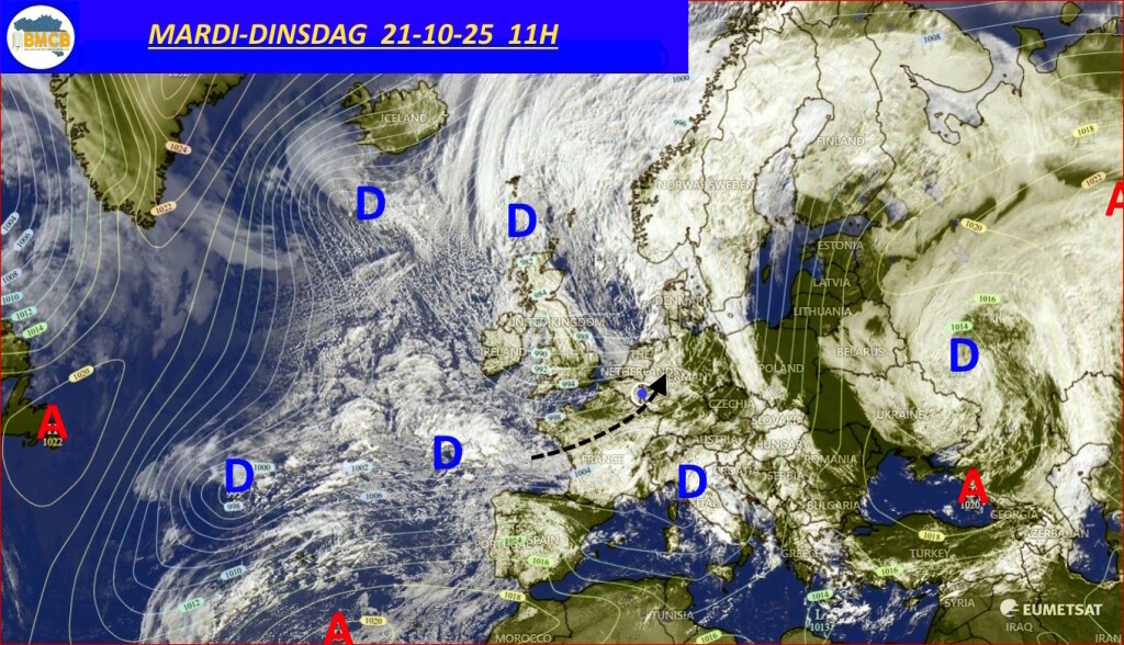 De nog vrij zachte maar onstabiele oceaanlucht boven onze regio's zal zich woensdag tijdelijk stabiliseren, vóór de komst van een depressie van 992 hPa (waarde op woensdagmiddag), die zich ten westen van Bretagne zal verdiepen.