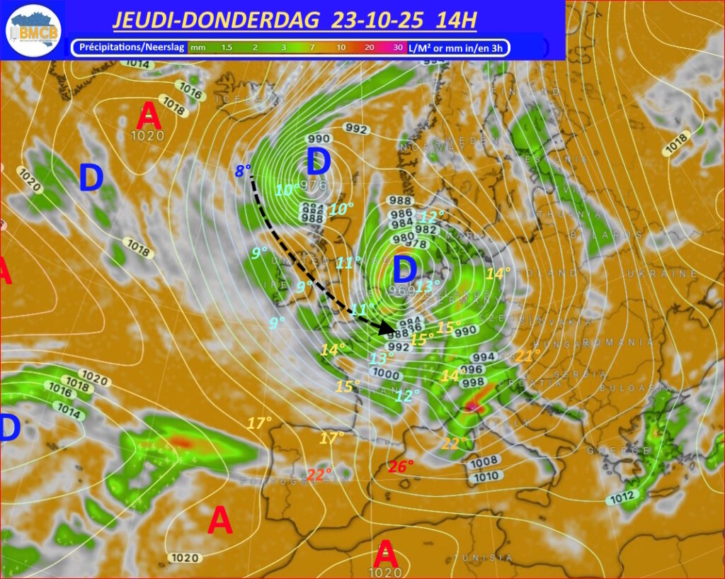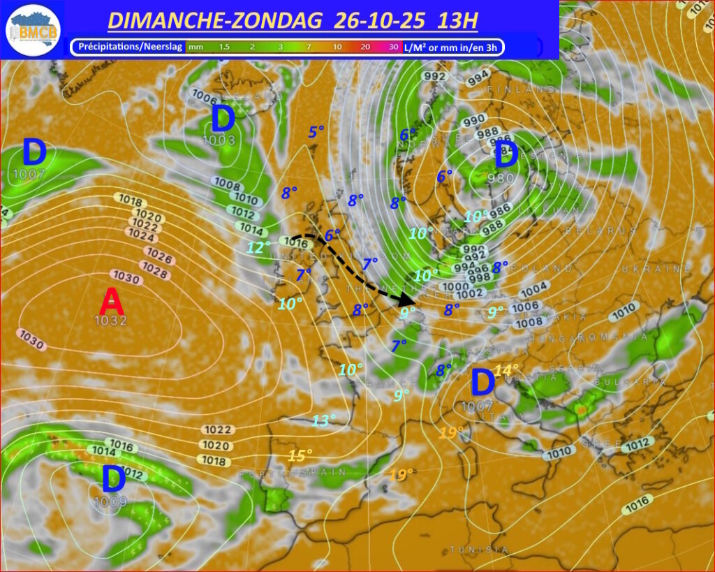 Wanneer het centrum van de depressie vrijdag en tijdens het weekend richting Scandinavië trekt (975–980 hPa), zal instabiele, steeds koudere polaire lucht onze regio's bereiken, met frequente buien, vooral in het noorden en oosten van het land.