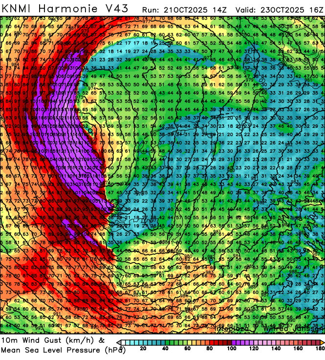 Met windstoten van 120 km/h in Utrecht en zelfs 100-plussers in de Achterhoek. Maar komt waarschijnlijk toch weer door dat overdreven uitgediepte secundaire laagje. ICON-D2 heeft een wat realistischer windveld.