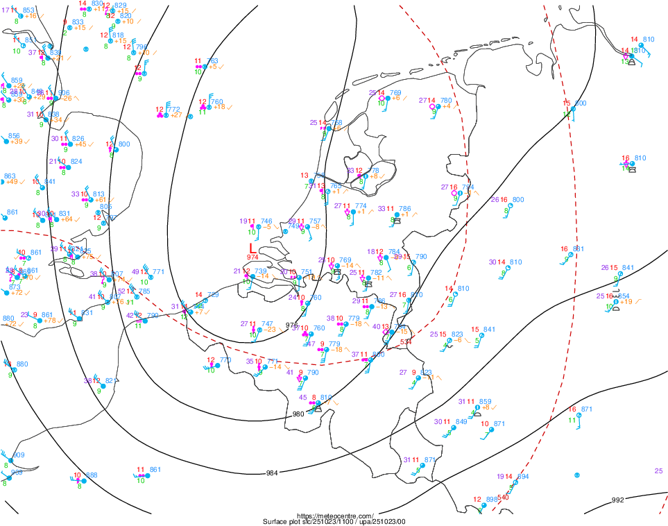 Is dat een analysekaart van de actuele druksituatie? Dan ontbreekt ook het knijpveldje in de isobaren aan de zuidkant van de kern. Kwamen veel modellen de laatste dagen steevast mee.