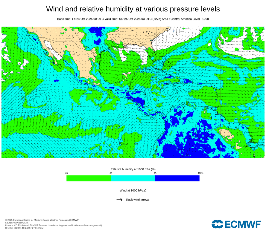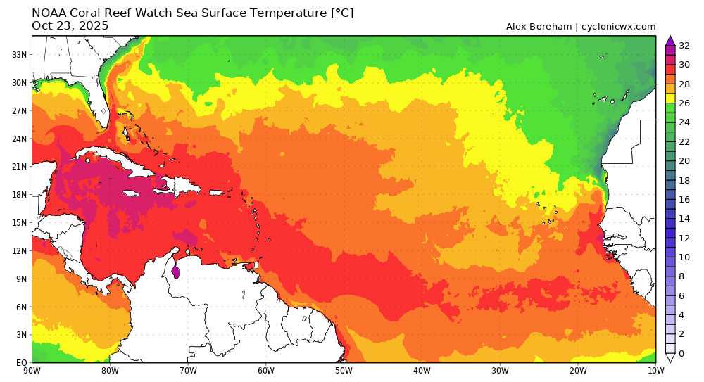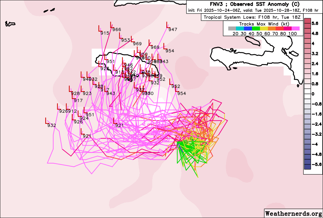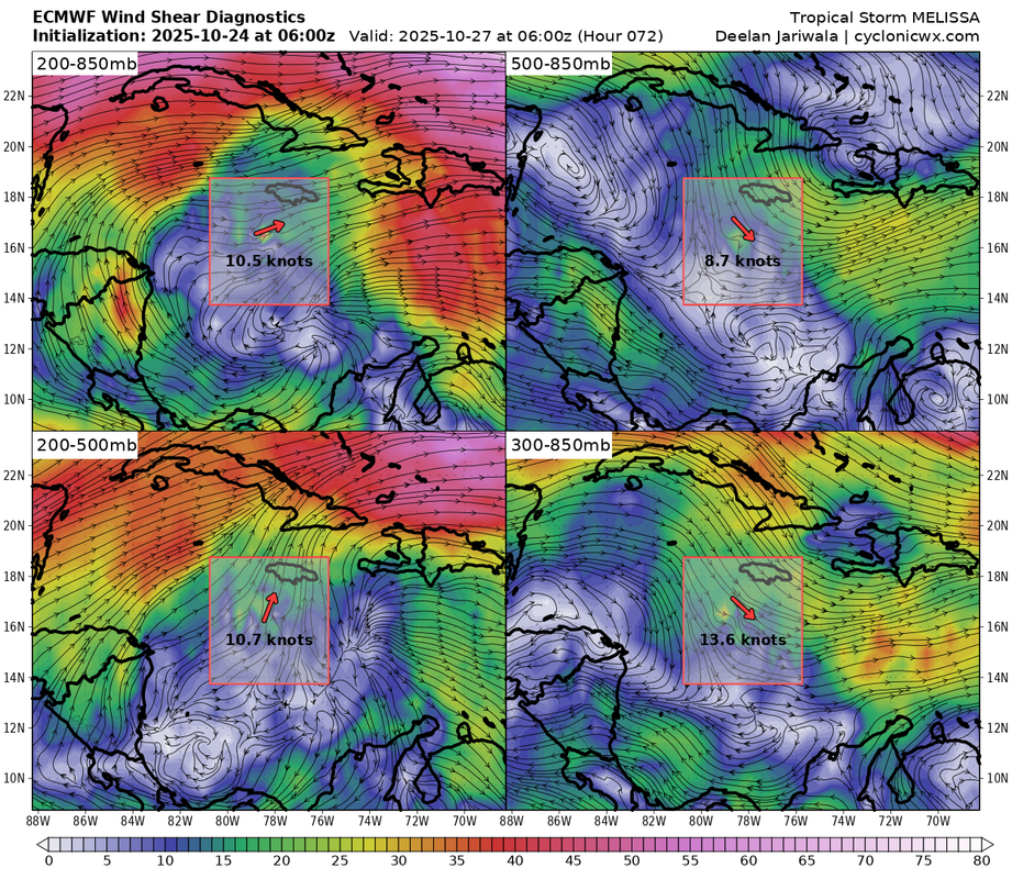 Melissa is op dit moment nog een tropische storm, met windsnelheden van 50 knopen (60 mph). Maar dit gaat in de komende dagen veranderen, Melissa is namelijk begonnen aan een Rapid Intensification (RI) proces. Daarbij gaat Melissa zich ontwikkelen tot een zéér krachtige orkaan, de NHC gaat uit van een piek van 130 knopen (150 mph). Het is uitzonderlijk, zo niet uniek, dat de NHC verwacht dat een tropische storm uitgroeit tot een categorie 4 orkaan met windsnelheden van 130 knopen, aangezien de NHC meestal voorzichtiger is met intense forecasts voor tropische stormen. De huidige situatie is dan ook extreem gunstig voor tropische cyclogenese, waarbij alle leden van het GDM-FNV3-ensemble (Google DeepMind) voor een Major Hurricane gaan.