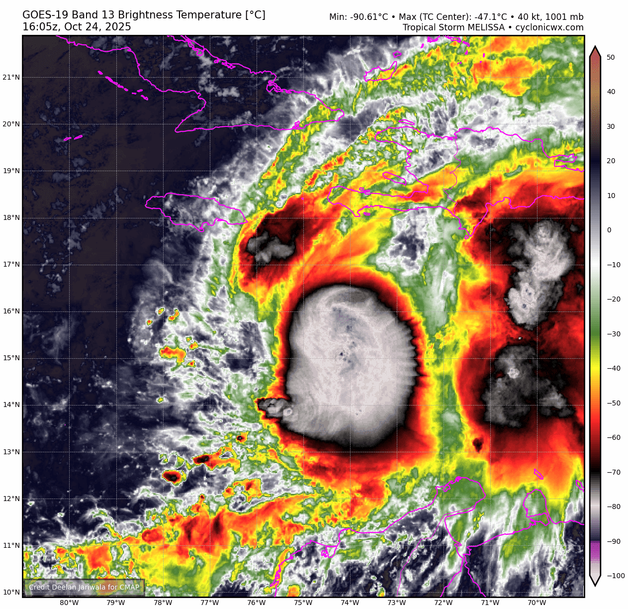 Dan nog even de huidige ontwikkeling van Melissa. Zoals eerder gezegd, het RI-proces is inmiddels begonnen. Er ontstaan veel convectieve bursts binnen het systeem, wat een duidelijke indicatie is van intensificatie. Daarnaast neemt de temperatuur van de wolkentoppen af. De structuur van het systeem begint er over het algemeen ook steeds beter uit te zien. De zwaartekrachtgolven zijn ook te zien op de zichtbare reflectiviteitsbeelden, maar daarvoor is het GIFje qua formaat net even te groot om te plaatsen. Op dit moment dus een minimale MSLP van 997 hPa en windsnelheden van 50 knopen, maar dit gaat in de komende uren en dagen toenemen, tot dat we waarschijnlijk een categorie 4 of 5 orkaan zullen zien boven het Caribisch gebied. Indien Melissa uitgroeit tot een categorie 5 orkaan, wat mogelijk is, dan is het voor het eerst sinds 2005 dat we drie of meer categorie 5 orkanen in een orkaanseizoen op de NATL hebben.