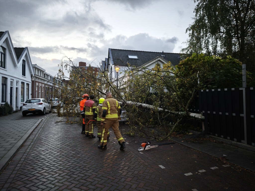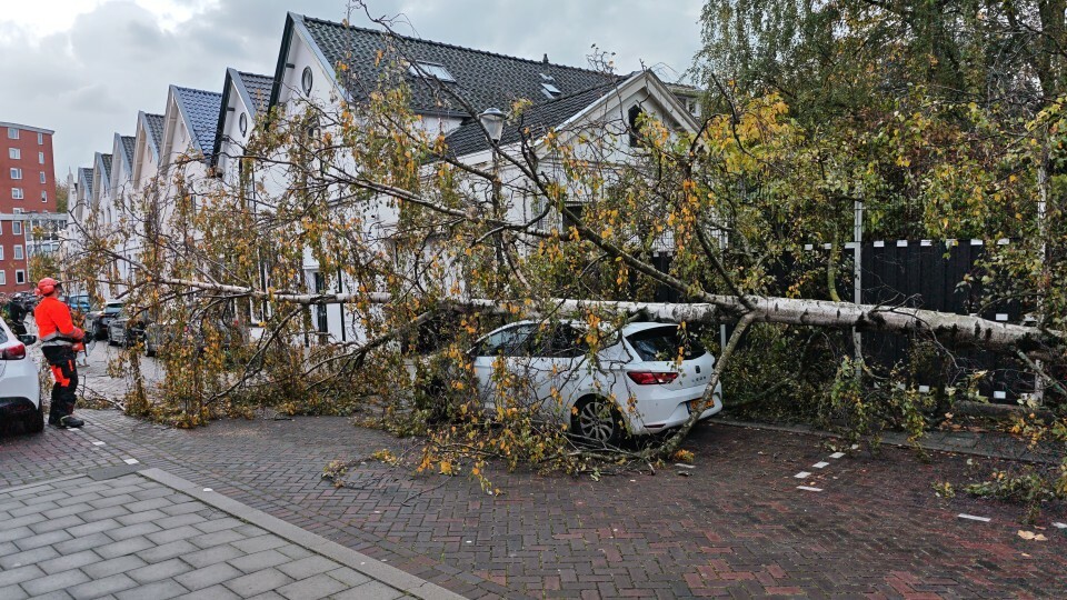 Zag ik onze blikvanger de berk tijdens een hagelbui met zware windstoten, geschat 90 a 95 km per uur omwaaien, gelokt op eventueel onweer, heftige bui overigens....daarbij is ook een witte auto geplet...