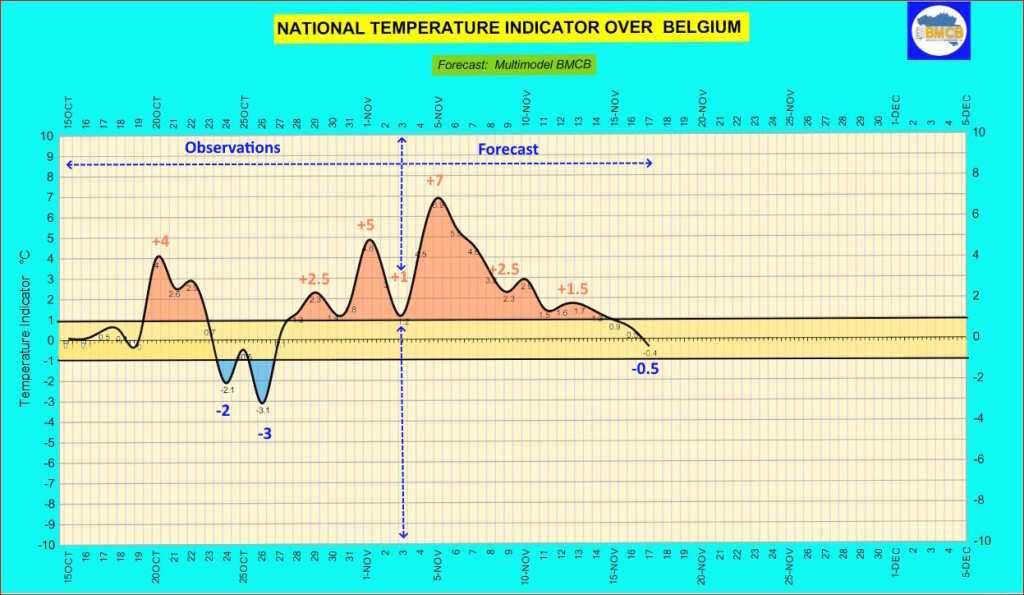 In de komende 48 uur zal de Belgische nationale temperatuurindex verder stijgen tot een opvallende waarde van +7 op 5 november, om vervolgens geleidelijk terug te keren naar een neutraal niveau rond half november.