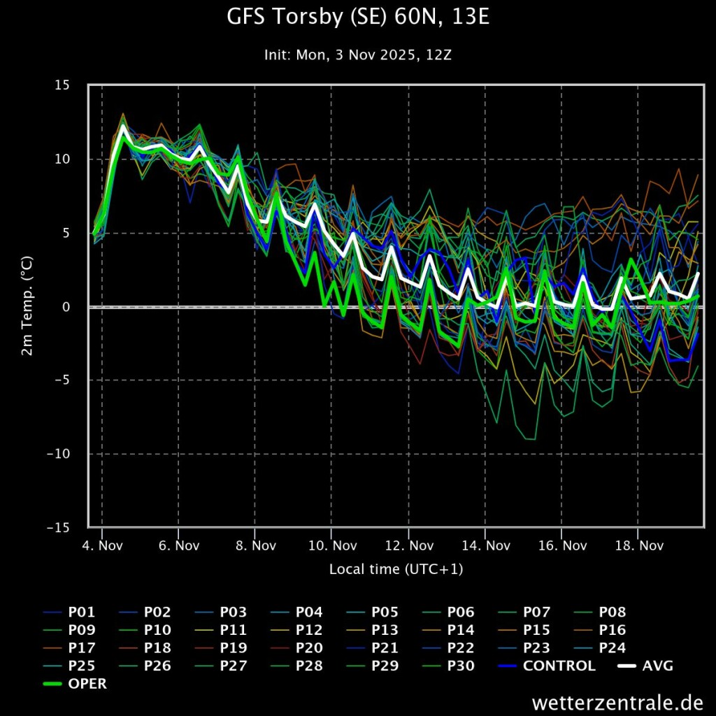 Hier nog even afwachten, nog geen doorzettend winterweer volgens het ensemble. Bifurcatie zit er nog in en het ensemble zwabbert nog wat, wat ook logisch is op deze termijn. Wel iets meer sneeuwsignalen, maar als ik de kaarten zo zie is de kans op hogedruk invloeden het grootst, dus zal sneeuwval gering zijn, mocht het al vallen en blijven liggen.