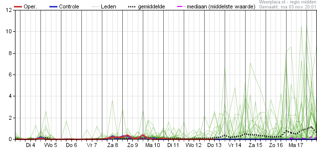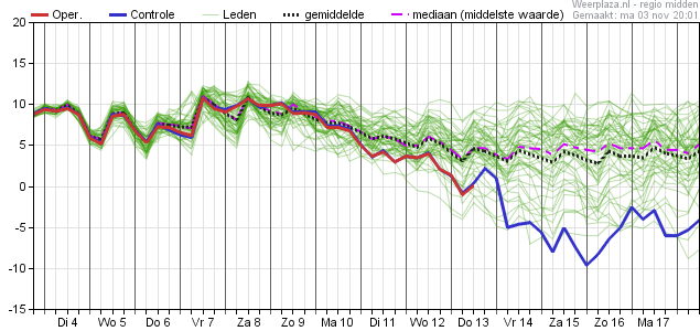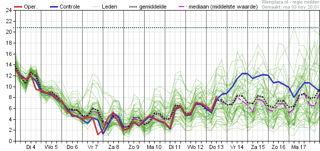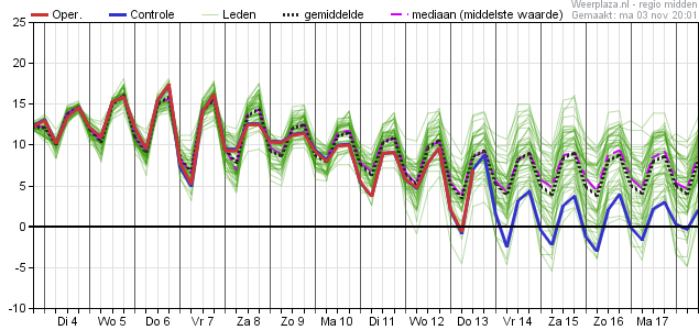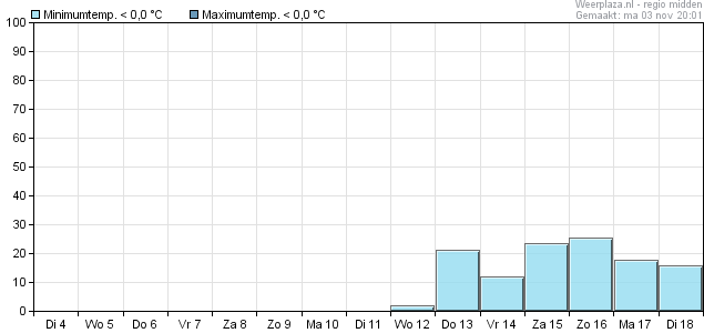 Daarna geleidelijk dalende temperaturen met op termijn overdag maxima onder de 10°C en in de nachten kans op vorst (maximaal zo'n 26%).