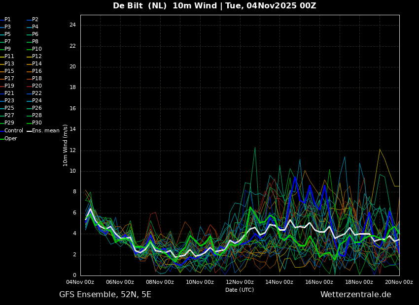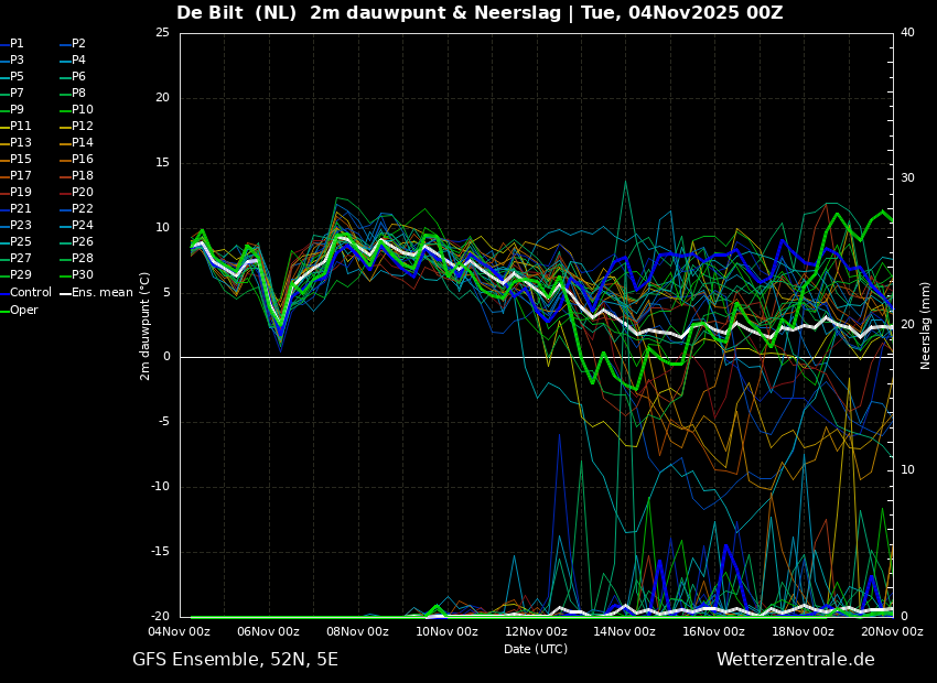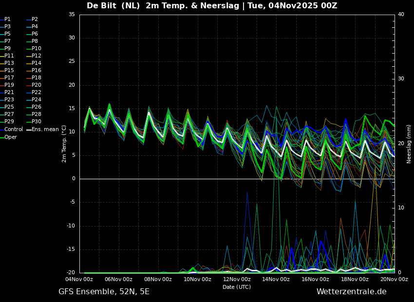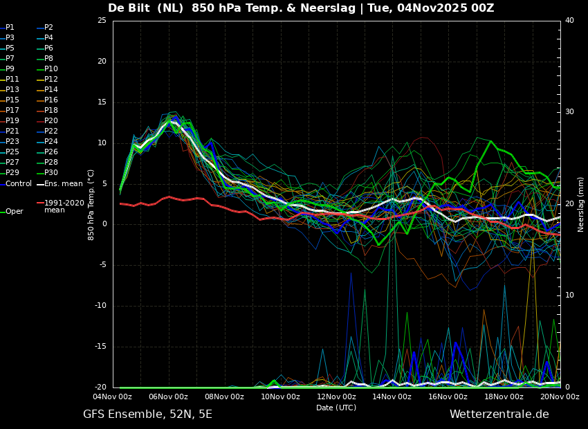 De eerste helft is vrij zacht en droog, terwijl de tweede helft beduidend frisser is en tevens weer enig neerslagsignaal laat zien.