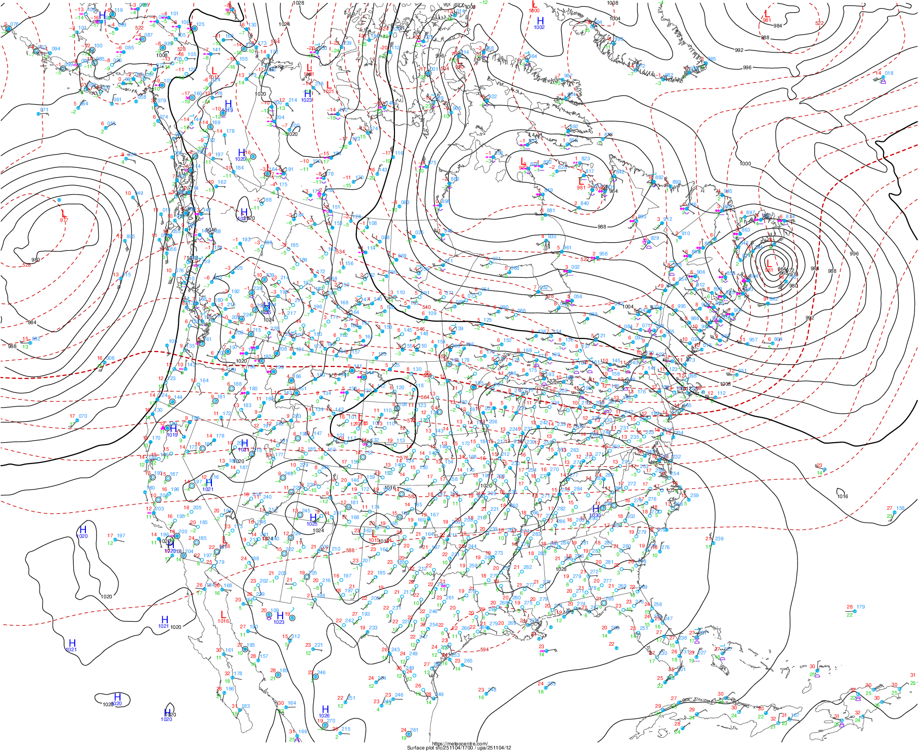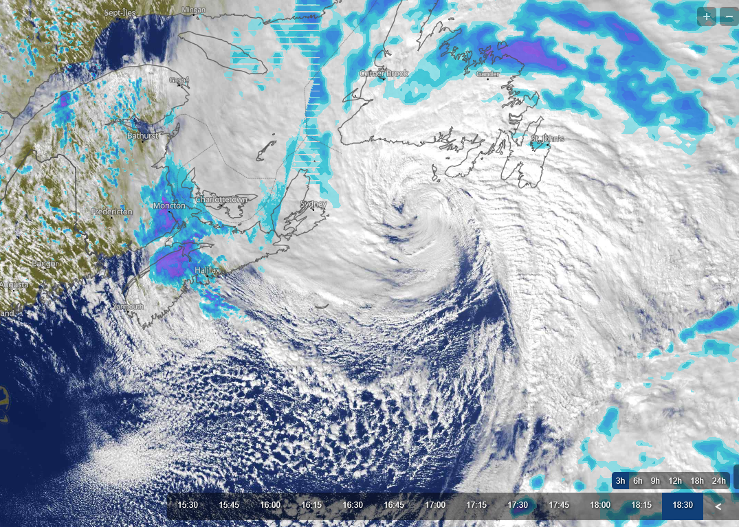 In de run van GFS zag ik een diep laag net ten oosten van Canada, dus ben ik eens gaan kijken hoe dat er nu uitziet. Inderdaad een fors systeem! Daarbij ook een grote Canadese weerkaart, van meteocentre.