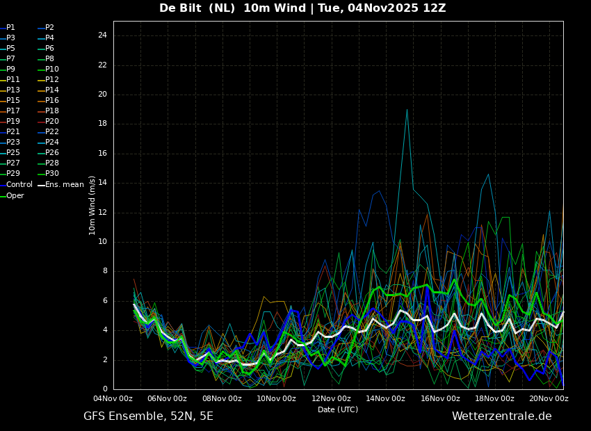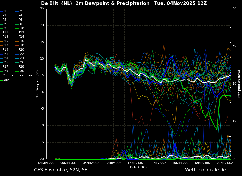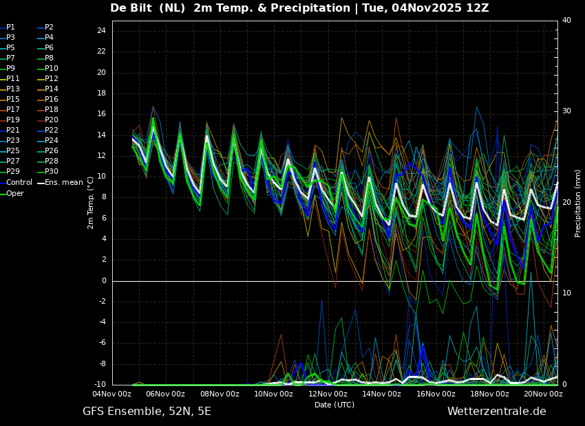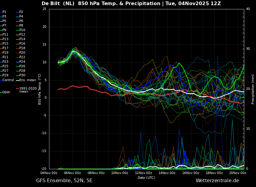 Een deel van de leden voorziet vanaf 10 november een opleving in neerslag, zonder dat grote hoeveelheden vooralsnog aan de orde lijken te zijn.