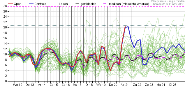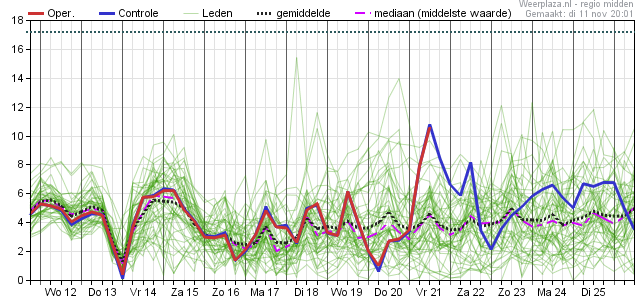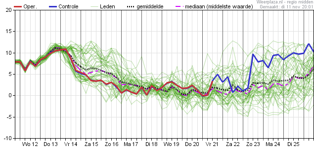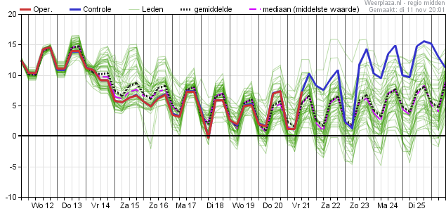 Vrijdag nog net aan 10°C volgens deze pluim en dan vanaf het weekend niet meer boven de 8°C met als voorlopig laagste maximum temperatuur zo'n 5 a 6° op donderdag 20 november.