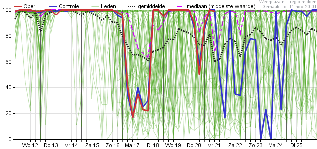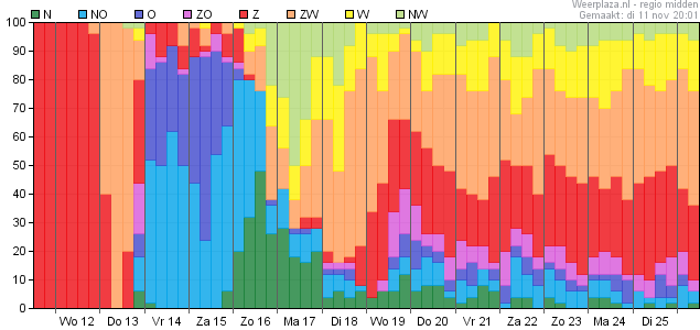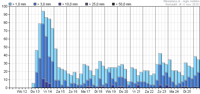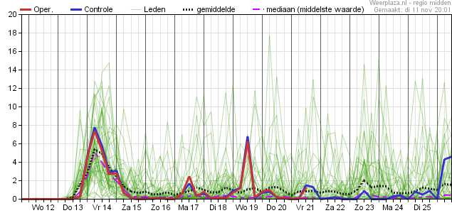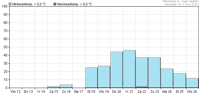 Vorstkansen zijn er zaterdag (1%) en zondag (3%) en dan dagelijks vanaf dinsdag de 18e met de grootste kansen op donderdag en vrijdag (20 en 21 november) met respectievelijk zo'n 44 en 46% kans.