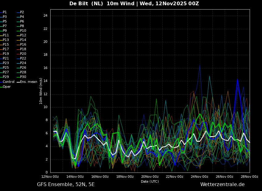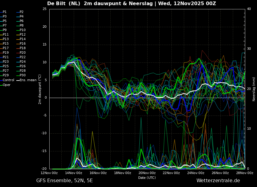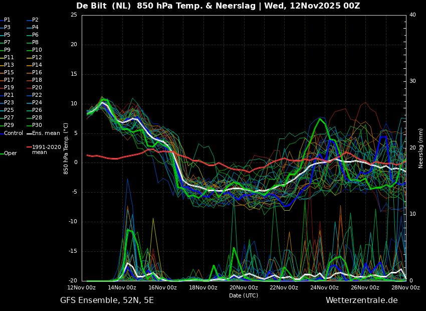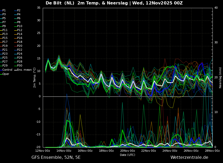 Tegen het eind van het ensemble lijkt de temperatuur weer wat op te lopen maar blijft nog steeds onder de 10°C