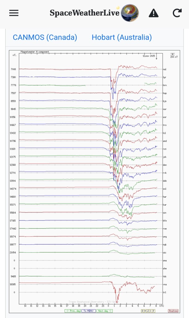 De magnetometer in Harestua vlakbij Oslo (gemarkeerd met "har" in de figuur) sloeg enorm uit vannacht. Dat moet een enorme show geweest zijn daar boven de nimbostratus. Maar er komen meer kansen de komende dagen, ook voor NL!
