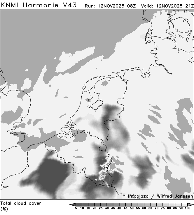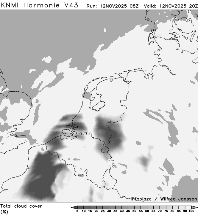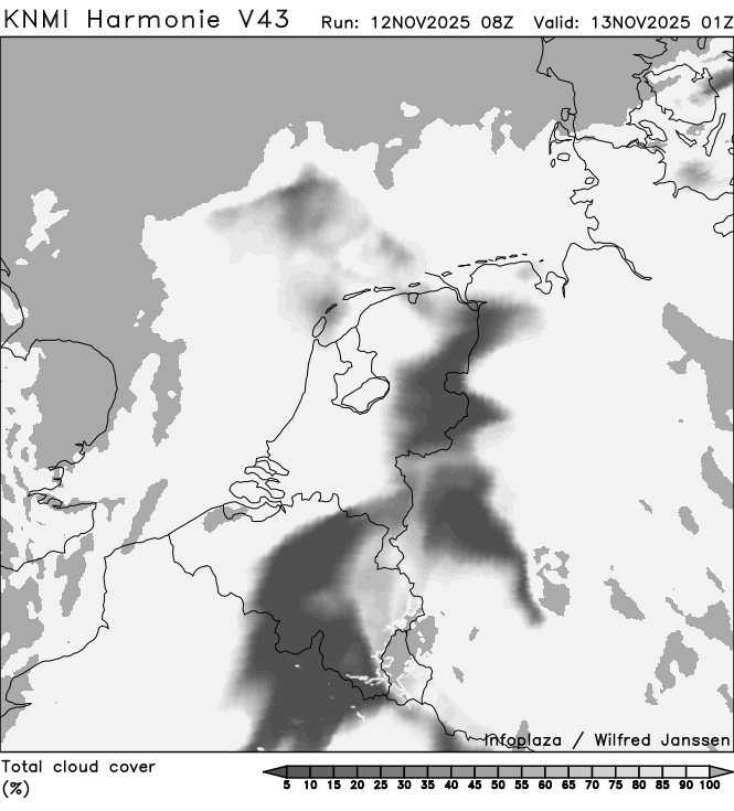 Als er volledige opklaringen zijn zonder hoge bewolking, dan zijn de beste kansen denk ik voor het oosten van de Benelux. Uiteraard is het ook mogelijk dat de hoge bewolking erg dun is en dat we het Noorderlicht er sowieso wel doorheen zien als het zichtbaar gaat zijn.