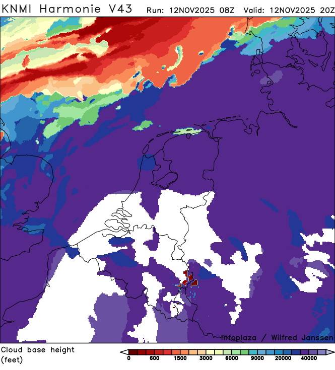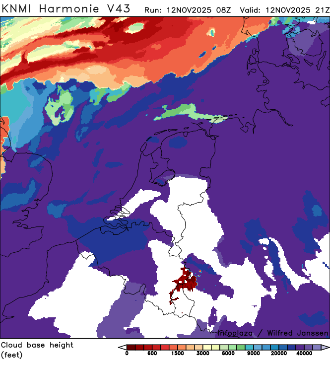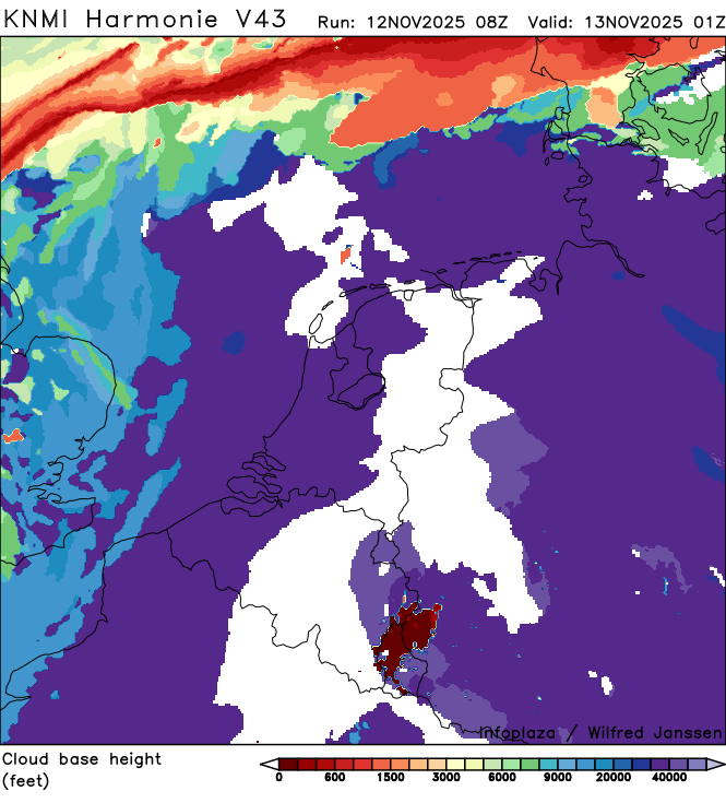 De bewolking van vanavond / vannacht bestaat enkel uit hoge bewolking. Goed te zien ook op de cloud base height kaarten van Harmonie. Enkel in de oostkantons van België en het noorden van Luxembourg lijkt wat mist te kunnen ontstaan.
