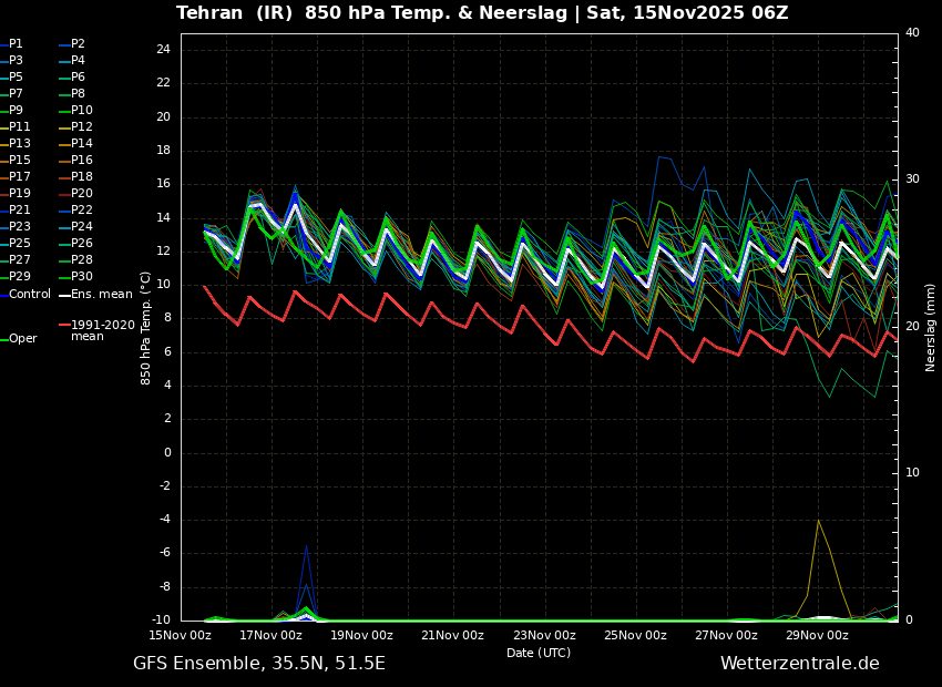 Teheran, een stad met 10 miljoen zielen. Evacueren? Bijna niet te doen. Ik heb met Iran te doen. Dit is overduidelijk een direct gevolg van de grilligheid van het nieuwe klimaat. En kijk eens naar het ensemble: structureel dik boven de norm en kurkdroog. En dat al maandenlang. Vergeleken deze regio's valt het bij ons hartstikke mee. Maar geen land is nog 'veilig '. Adopteren is de enige uitweg.