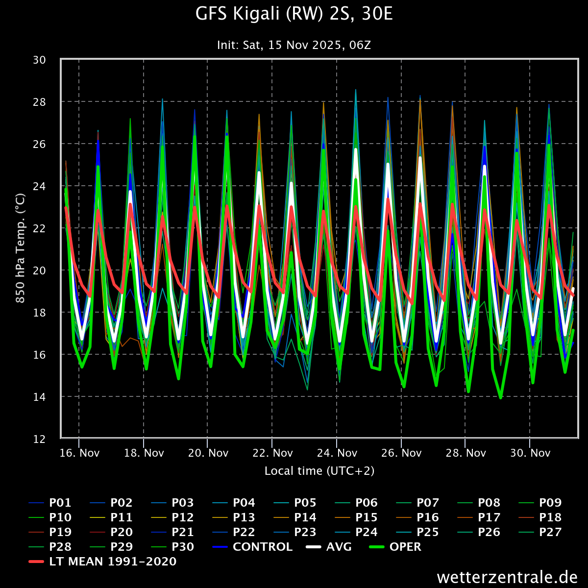 Bekijk maar eens ensembles van andere hooggelegen locaties, zeker daar waar er een stabiel klimaat heerst valt het direct op. Bij Teheran ligt het 850hPa vlak wellicht nipt boven het land (?), dat lijkt qua hoogte op iets als Kigali (Rwanda).