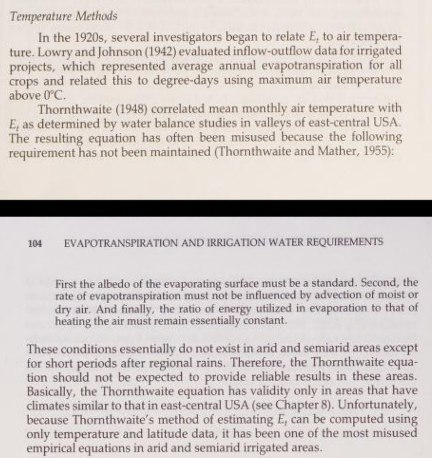 Hun implementatie heeft ook nog een vreemde fout in de coëfficiënt van een van de vergelijkingen. Een fout je vaker in de wetenschappelijke literatuur tegenkomt (welke ze niet citeren), maar niet overeenkomt met Thornthwaite (1948) welke ze citeren. Voor het resultaat is de invloed daarvan beperkt, maar het is wel buitengewoon slordig en niet zoals het hoort in de wetenschap. Je citeert wat je gebruikt, niet meer en niet minder. Het maakt reproductie onnodig ingewikkeld.