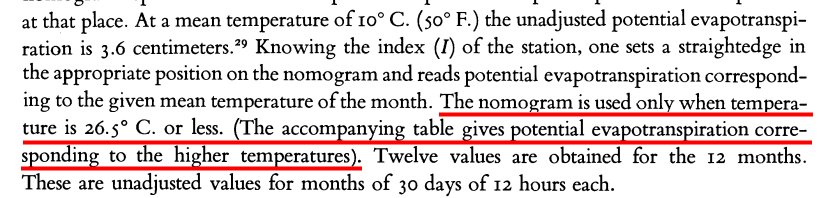 Nog een fout in hun implementatie (het houdt niet op...) is hoe ze corrigeren voor de lengte van de maand. De methode beschreven door Thornthwaite geeft in eerste instantie een potentiële verdamping die geldig is voor 30 dagen van elk 12 uur daglicht. Dit wordt dan lineair gecorrigeerd op basis van de werkelijke lengte van de maand en daglicht.