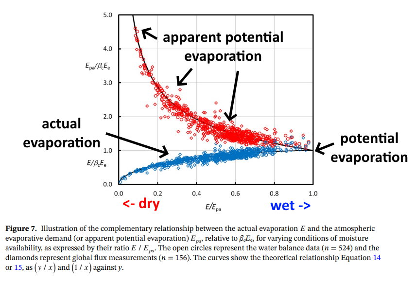 De reden dat KNMI beweerd dat het omhoog gaat is omdat ze (ogenschijnlijke) potentiële verdamping modelleren, waarvan het minstens al sinds Bouchet (1963) duidelijk dat die in tegengestelde richting ontwikkelt tijdens een toenemende droogte. Verdamping gaat omlaag (er is geen water), mede daardoor neemt de luchttemperatuur toe en relatieve luchtvochtigheid af, en dus gaat de (hypothetische) potentiële verdamping omhoog. Beide zijn een keerzijde van exact dezelfde medaille, onlosmakelijk met elkaar verbonden: