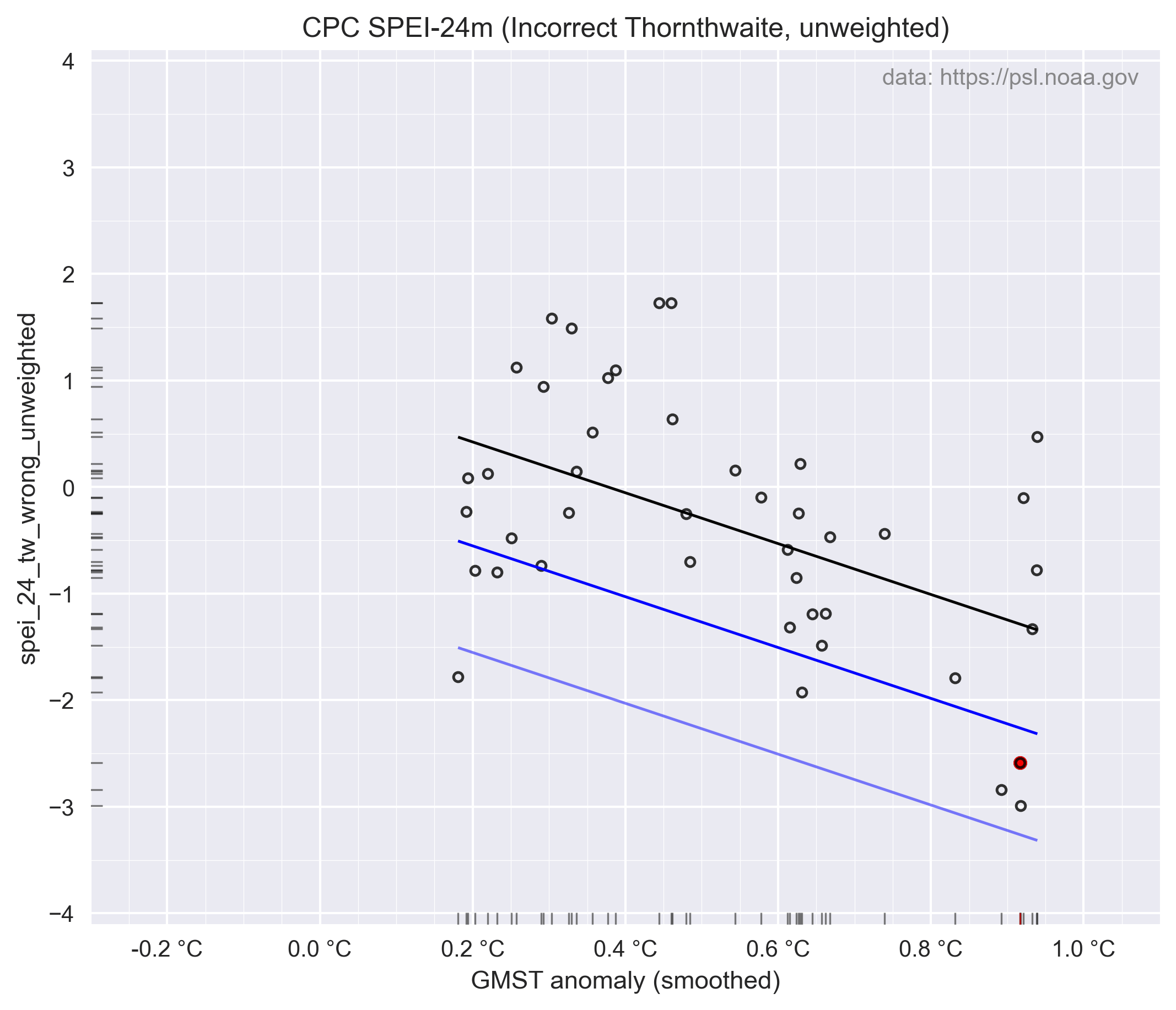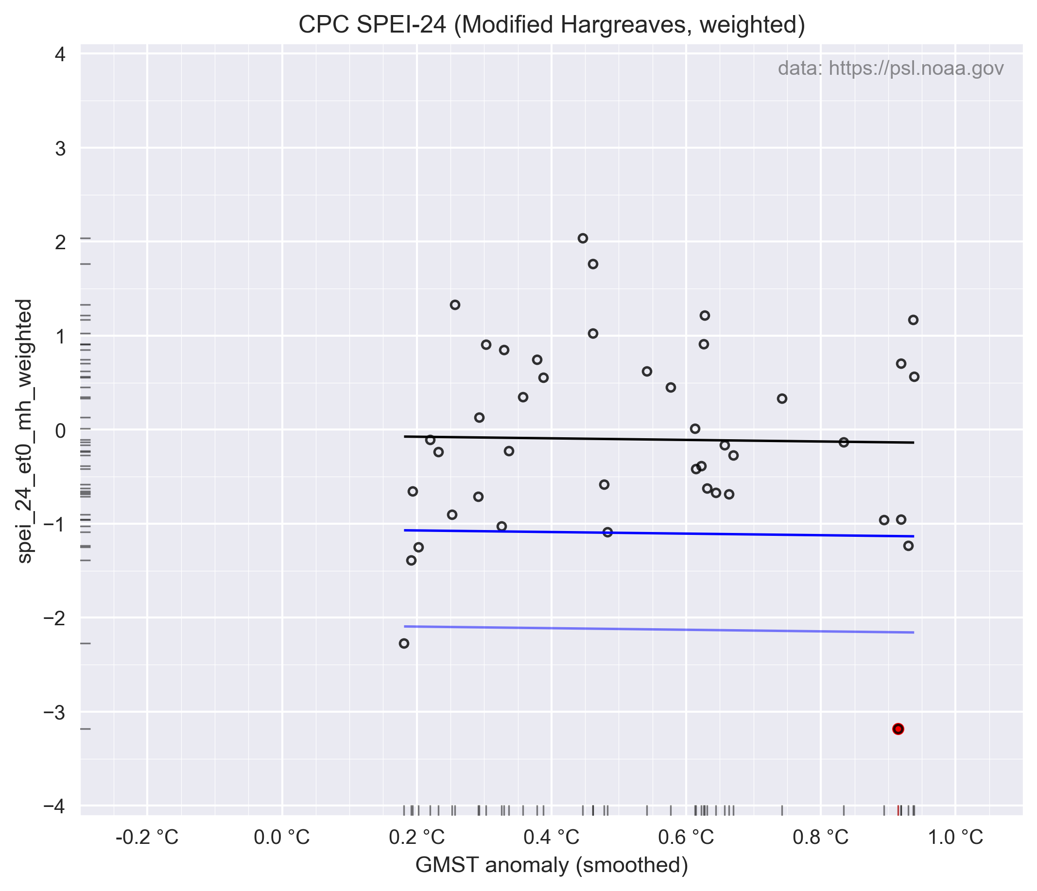 Ironisch genoeg zorgt de drang van het KNMI om deze droogte aan klimaatverandering te koppelen er ook toe dat de droogte zelf (hun "event") minder extreem wordt (een hogere SPEI-24) ten opzichte van bijvoorbeeld modified-Hargreaves. Zie de rood gearceerde stip in de regressie hierboven, die heeft een lagere SPEI-24 waarde dan bij het gebruik van Thornthwaite (en staat meer op zichzelf als een daadwerkelijk extreme gebeurtenis.