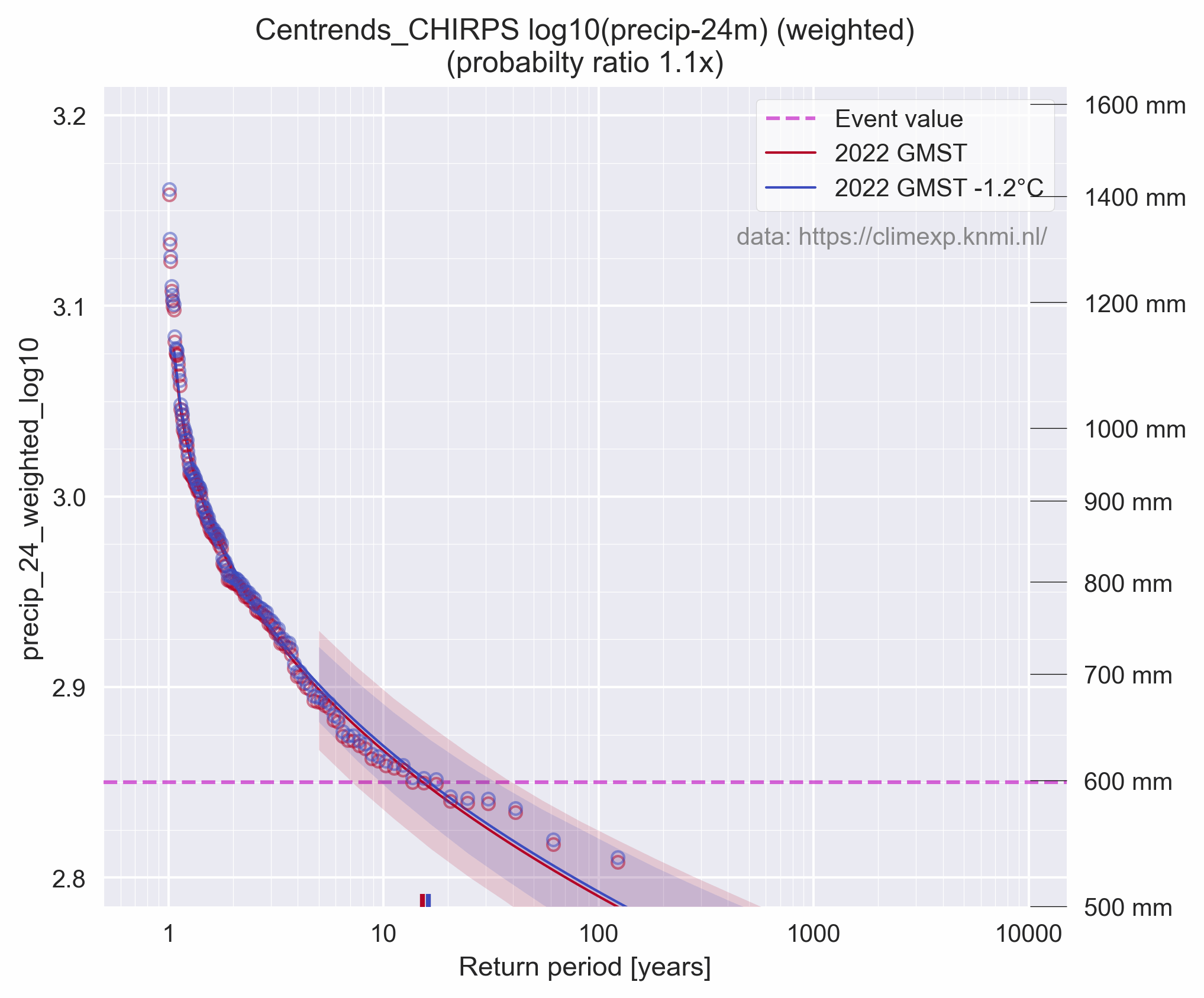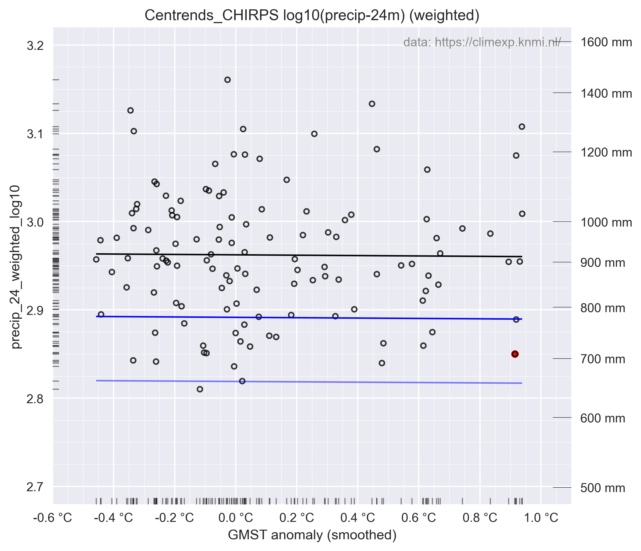 Persoonlijk vind ik de hele opzet van de studie buitengewoon bedenkelijk. Met name hoe de SPEI-24, wat letterlijk al een maat van waarschijnlijkheid is, wordt opgeblazen door de regressie met de wereldwijde temperatuurafwijking. Omdat in dit geval de neerslagtrend verwaarloosbaar klein is wordt de trend in de SPEI-24 volledig bepaald door de lokale temperatuur, die als gevolg van de implementatiefouten extreem gevoelig is. Effectief doen ze dus een regressie tussen wereldwijde en lokale temperatuur, en uiteraard zit daar een correlatie tussen. Er is wat mij betreft echter geen reden om de maat (SPEI-24) die al een functie is van lokale temperatuur dan nogmaals lineair te corrigeren met de wereldwijde temperatuur. Het wekt op mij de indruk dat het effect van temperatuur twee keer wordt toegepast (lokaal + wereldwijd). De invloed van klimaatverandering uit zich uiteraard (met name) in de lokale temperatuur, de wereldwijde temperatuur is meer een statistische aggregatie achteraf, die niet causaal doorwerkt in lokale effecten. Voor wie het zich afvraagt, de "locatie" van de Normaalverdeling (wat empirisch gezien het gemiddelde van de data is) wordt lineair geschaald met de wereldwijde temperatuur. Ik begrijp ook niet waarom ze niet direct de gebruikte "Generalized Logistic" distributie voor de SPEI-24 schalen, ook daar zit een enorme onzekerheid in die nu niet wordt meegenomen in hun onzekerheidsmarge (via bootstrapping).