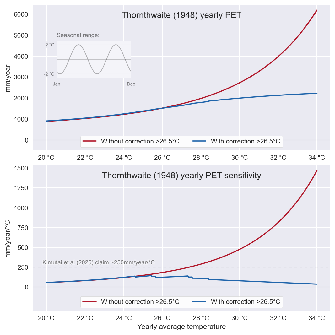 De belangrijkste fout die ze maken in hun implementatie van Thornthwaite (1948) is het weglaten van de correctie voor (maandgemiddelde) temperaturen boven de 26.5°C. De gegeven formules zijn daarboven niet langer geldig en er moet gebruik gemaakt worden van een lookup-table (zie zijn figuur 13). Dit weglaten maakt de methode extreemgevoelig voor temperatuur en resulteert in onrealistisch hoge toename van potentiële verdamping met opwarming. De Hoorn van Afrika (hun aoi) heeft vaak maandgemiddelde temperaturen die daar ruim bovenuit komen. De methode is wat vreemd omdat je 12 maanden (tegelijk) nodig bent om een resultaat voor elk van die maanden te krijgen. Anders gezegd, het temperatuurverloop door het jaar is van invloed op de potentiële verdamping van een enkele maand in dat jaar. Dit maakt het ook wat ongemakkelijk omdat het KNMI ervoor kiest om het op "kalender jaren" toe te passen, hierdoor wordt bijvoorbeeld de potentiële verdamping in maart beïnvloed door de temperatuur later in het jaar (november, december etc). De causaliteit daarvan is natuurlijk nogal dubieus. Logischer zou zijn om het "lopend" toe te passen waarbij voor elke maand de voorgaande 11 maanden gebruikt worden, dat voorkomt tijdreizen.