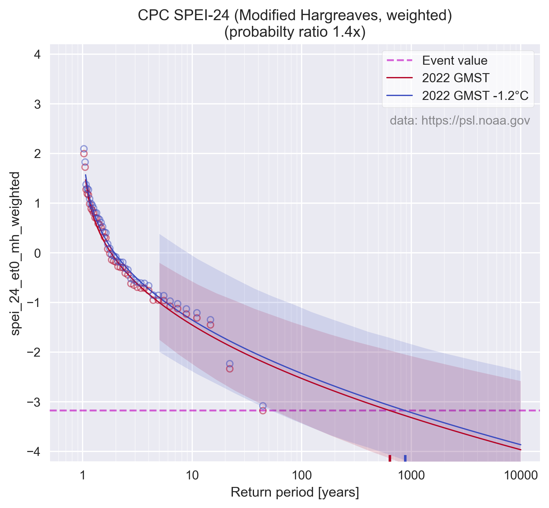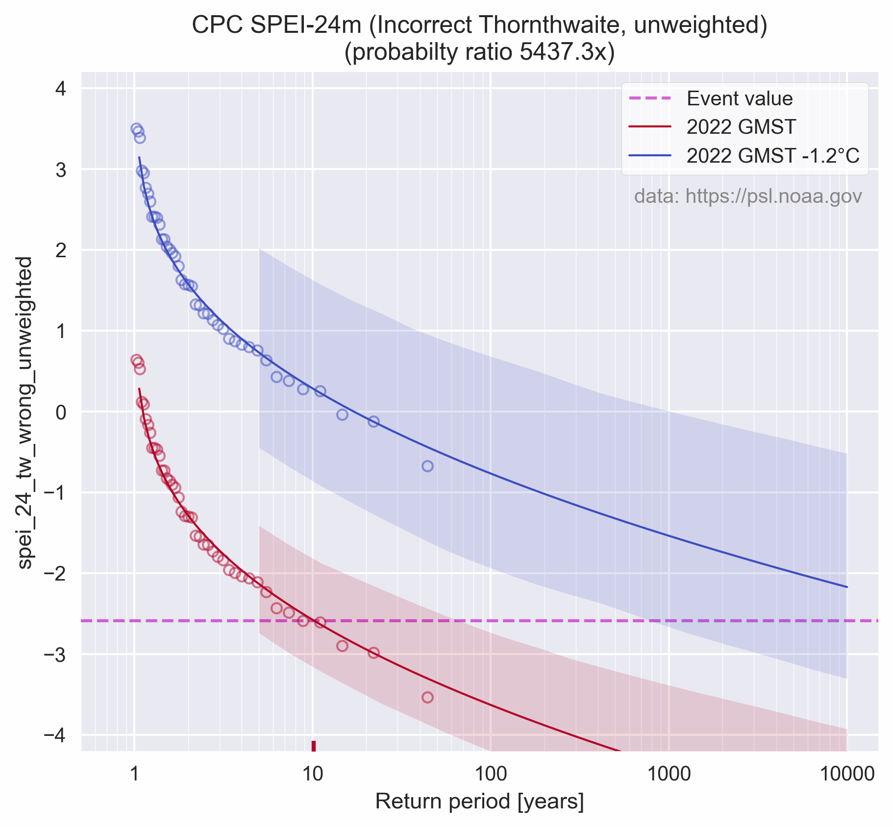 Mijn replicatie is behoorlijk maar niet perfect, de in de studie genoemde probabilty-ratio van 5500x voor de CPC SPEI-24 is bij mij 5437.4x. Na het oplossen van de bovengenoemde implementatiefouten (en nog wat andere) neemt dat af tot 409.8x. Dus het "effect van klimaatverandering" op de onderzochte droogte wordt dus een heel stuk minder. Dat is echter nog steeds met de wat mij betreft volstrekt ongeschikte Thornthwaite (1948) methode.
