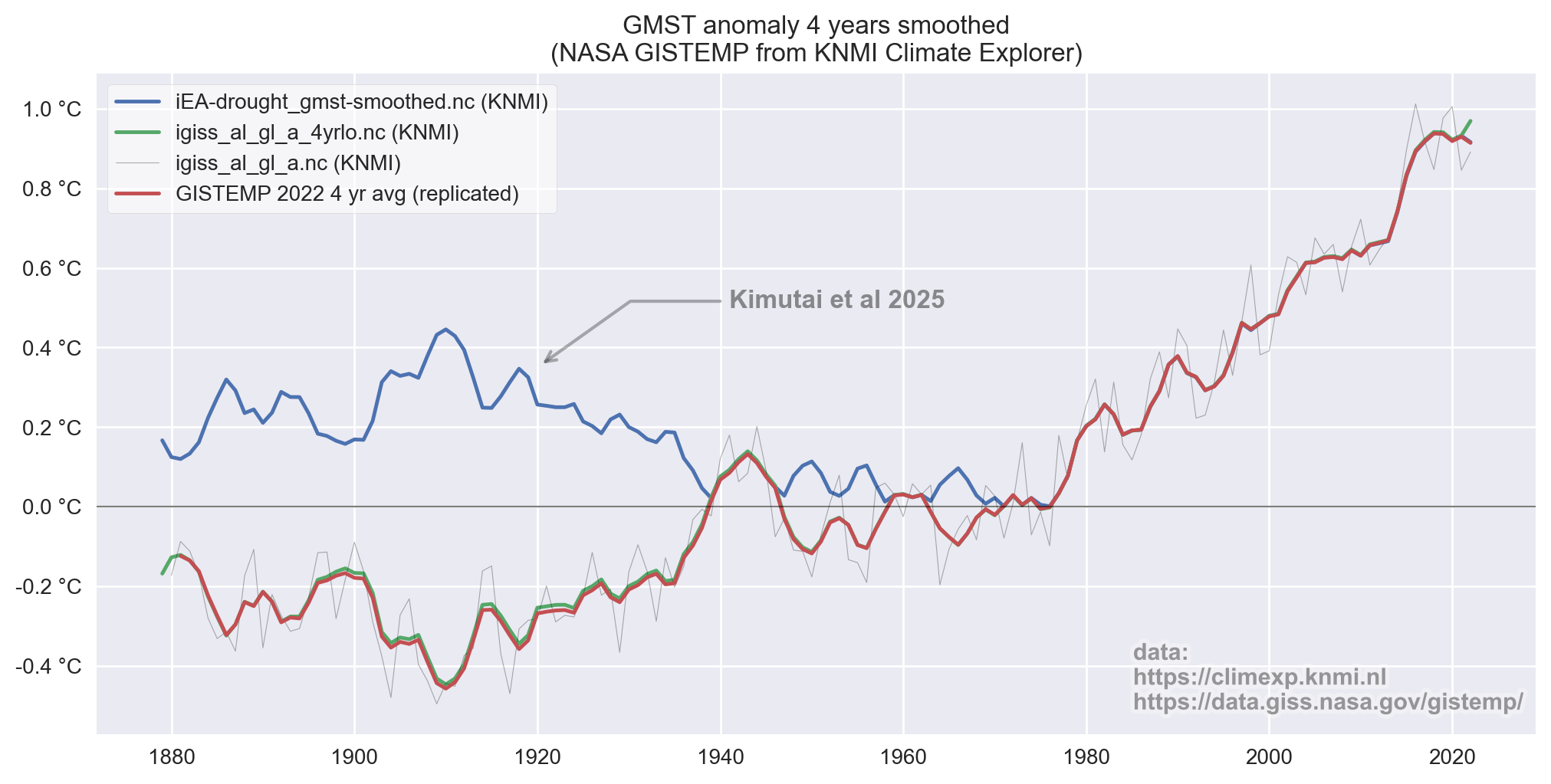 Onderstaande grafiek laat die temperatuur zien, maar ook de originele NASA GISTEMP zien (vergelijkbaar bewerkt met een 4-jaar lopend gemiddelde) en ook nog een andere variant, ook van KNMI Climate Explorer. Het verschil is meteen duidelijk, en op het oog kan je al zien dat dit verschil symmetrisch is rond 0°C. Oftewel, KNMI gebruikt in hun studie de positieve waarde van de temperatuurafwijking ("abs(gmst)" i.p.v. "gmst"). Bizar natuurlijk.