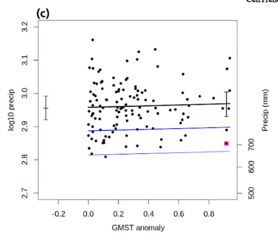Eerst een iets duidelijkere fout welke wellicht wat makkelijker te begrijpen is. In de studie maken ze gebruik van de wereldwijde temperatuurafwijking, het KNMI gebruikt daarvoor NASA GISTEMP. De statistische constructie waarin ze dit toepassen is al vrij bizar. Ze doen een regressie tussen de wereldwijde temperatuurafwijking (x-as) en de lokale neerslag welke log10 geschaald is (y-as). Daarbij wordt de temperatuur bewerkt door een lopend 4 jaar gemiddelde te nemen (zie uitleg op KNMI Climate Explorer). De lokale neerslag is een combinatie van de Centrends & CHIRPS datasets en loopt van 1900-2022. De regressie in de studie ziet er dan alsvolgt uit, hun figuur 5c: