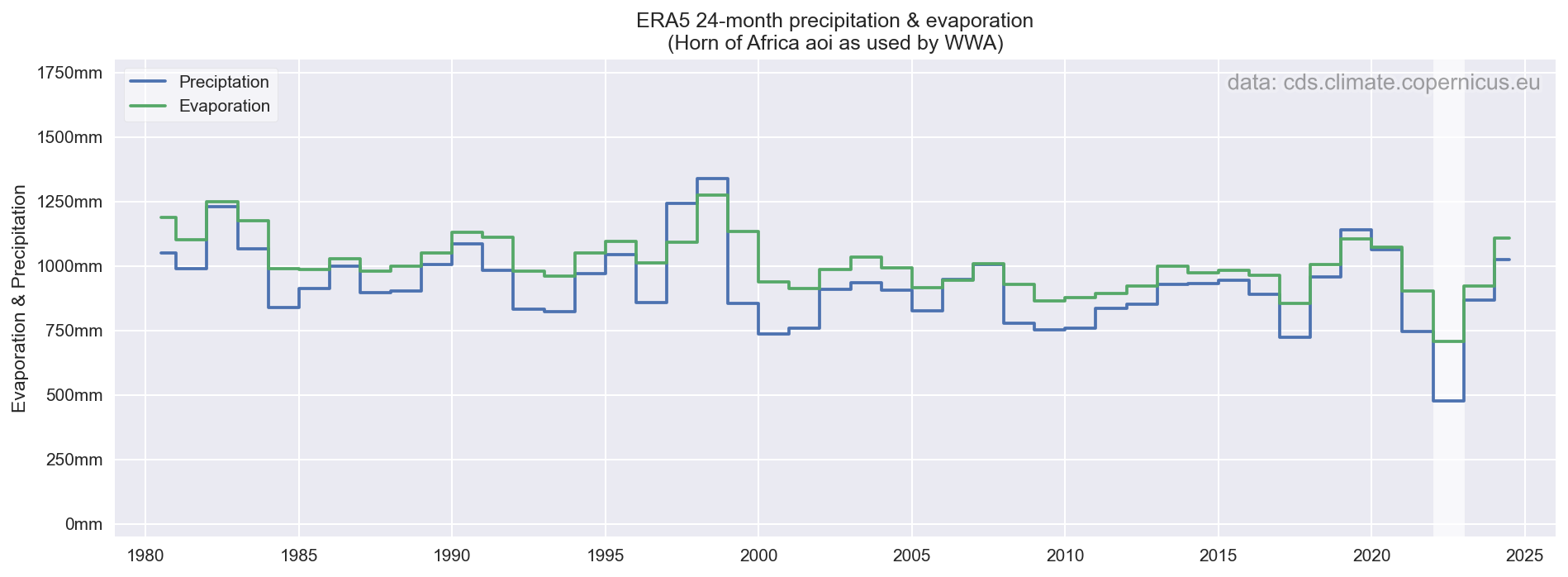 Op basis van ERA5, voor hetzelfde gebied, is dat ook duidelijk te zien. Onderstaande grafiek is op basis van dezelfde 24-maanden als gebruikt in de studie (dus per jaar, niet lopend per maand...). Binnen de periode van deze studie (1980-2022) is meteen duidelijk dat zowel de neerslag als verdamping het laagste is voor 2022, verdamping gaat dus duidelijk omlaag, niet omhoog. Nu is ERA5 wellicht niet de allerbeste bron voor verdamping, maar het zal op dit regionaal niveau de trend (omlaag vs omhoog) wel te pakken hebben. Andere datasets (GLEAM, Wapor etc) zullen een vergelijkbaar signaal geven, maar ongetwijfeld met een iets andere absolute hoeveelheid.