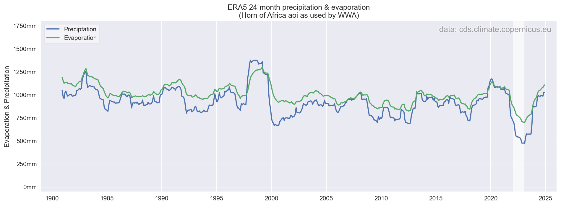 Ze doen ook nog een vergelijkbare handeling maar dan met SPEI-24. Deze berekenen ze door eerst een "neerslagoverschot" te berekenen, het verschil tussen de neerslag en de bovengenoemde potentiële verdamping op basis van Thornthwaite (1948). Omdat daar de temperatuur voor nodig is gebeurt dit slechts vanaf 1980 (op basis van NOAA PSL CPC data). Dat "neerslagoverschot" wordt vervolgens statistisch omgevormd tot de SPEI-24 door een "Generalized Logistic" verdeling te fitten en de daarmee gevonden kans uit te drukken als een Normaalverdeling (Gaussian) met een gemiddelde van 0 en standaarddeviatie van 1. De details van de distributie en manier van fitten (L-moments) zijn te vinden in Hosking & Wallis (1996).