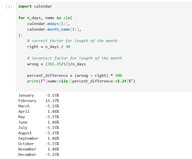 In de eerste versie stond een voorbeeldje voor de fout met de correctie van de maand. Dit liet enkel de foute correctiefactor zien in de studie gebruikt wordt. Omdat de goede correctiefactor het resultaat ook veranderd en in dit geval in de tegenovergestelde richting werkt is het uiteindelijk verschil nog groter voor de maanden zonder 30 dagen.