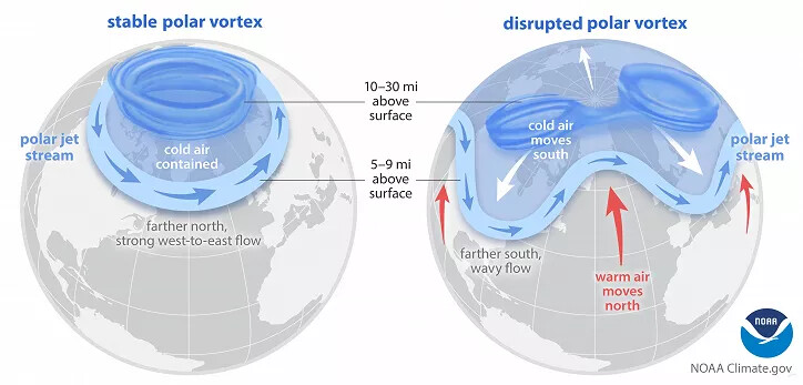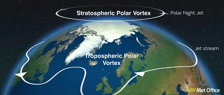 De poolwervel is een enorme ring van krachtige westenwinden die in de winter het koude poollucht rond de Noordpool vasthouden.