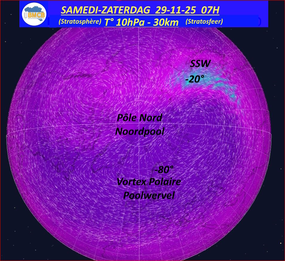 De stratosferische poolwervel (≈ 15–50 km): zichtbaar als een compacte band van westenwinden rond de pool.
